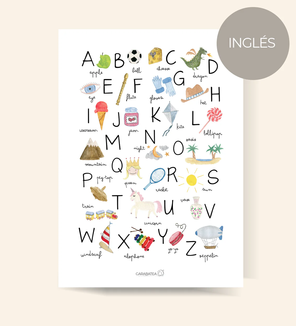 Lámina de acuarela original pintada a mano por Bea de Garabatea design. Forma parte de la serie infantil educativa compuesta por láminas de abecedarios en varios idiomas y la lámina de números. Si quieres, ¡puedes convertirla en un pack y llevarte ambas láminas a un precio más reducido!