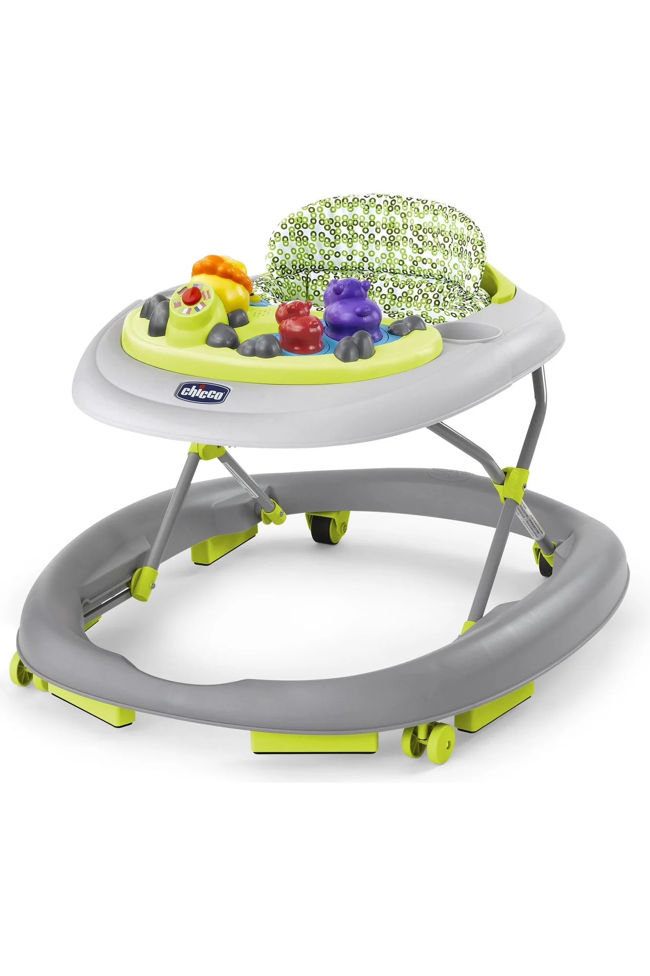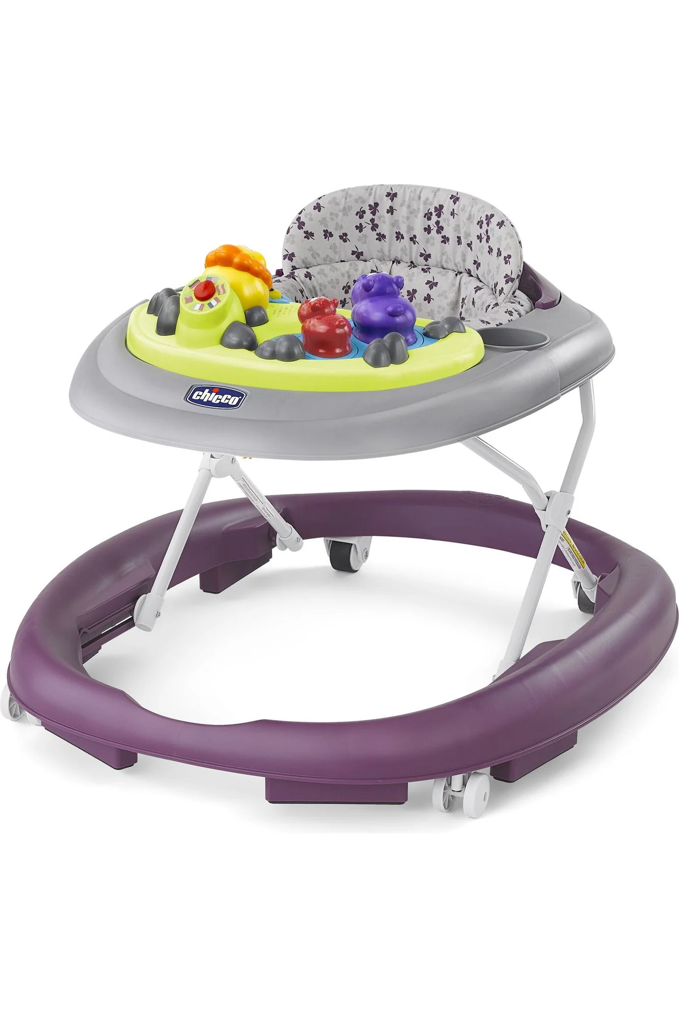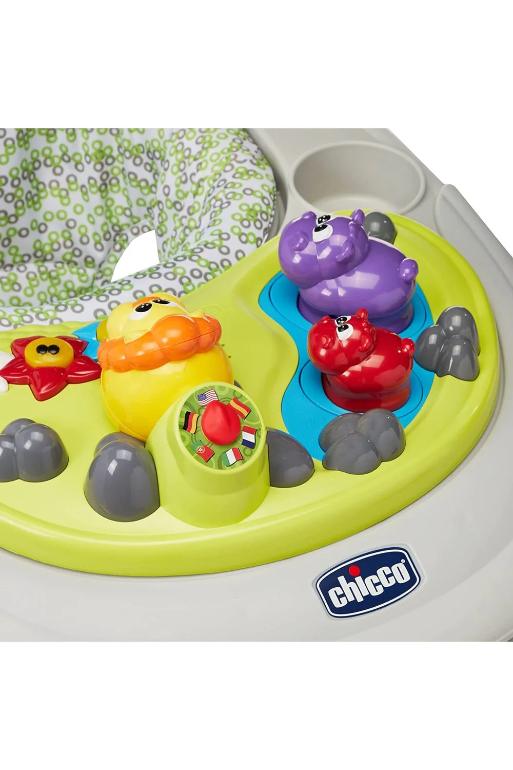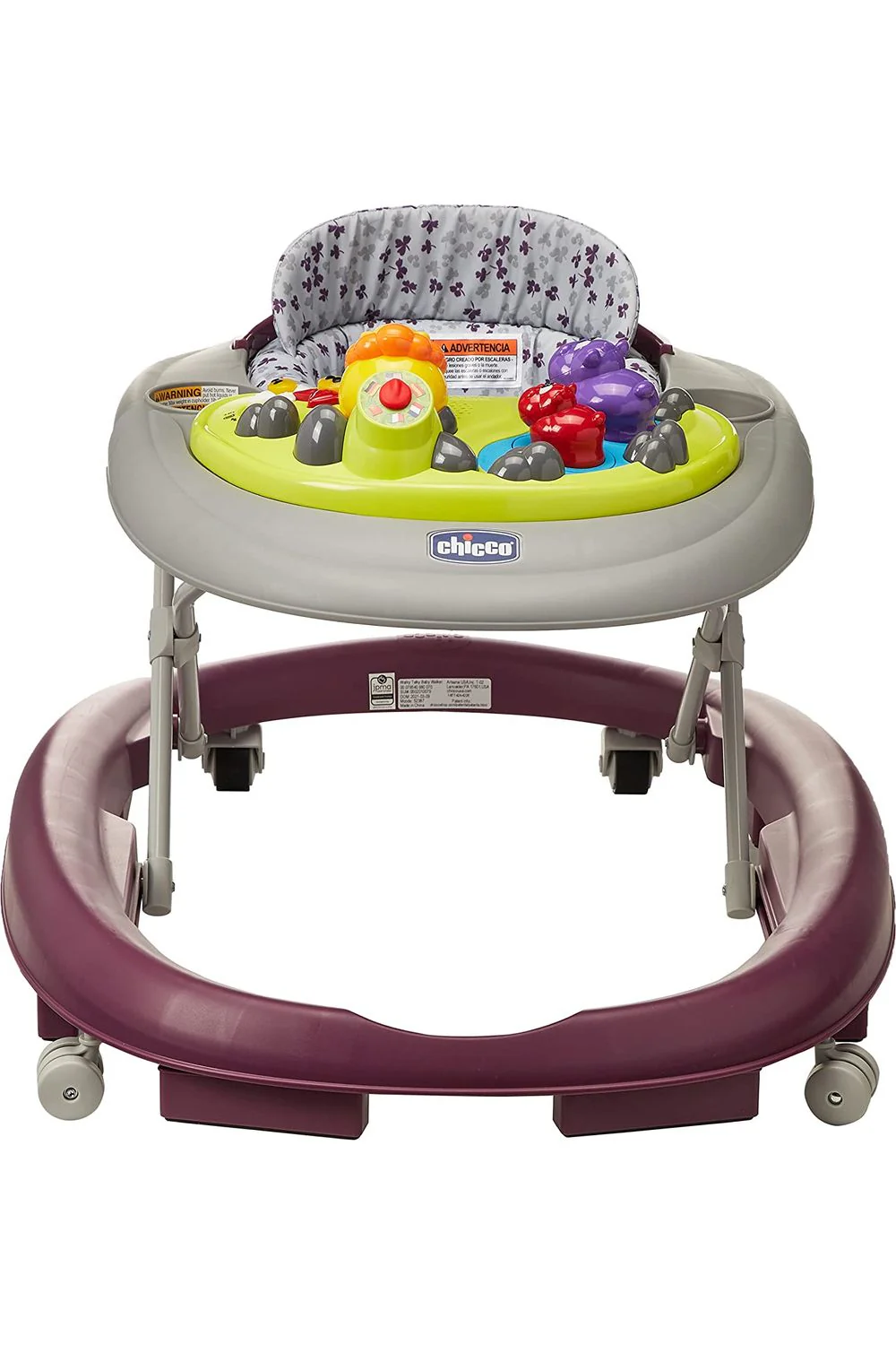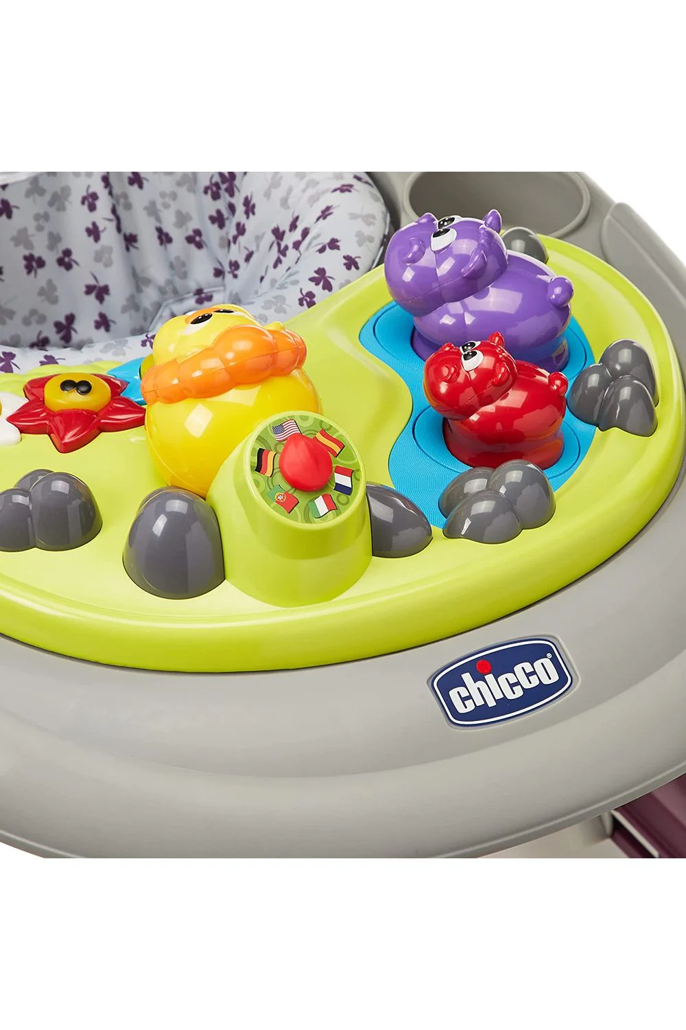 Primer andadera multilingüe que entretiene al bebé con el abecedario, los colores y las frases comunes en inglés, español, francés, italiano, alemán y portugués.