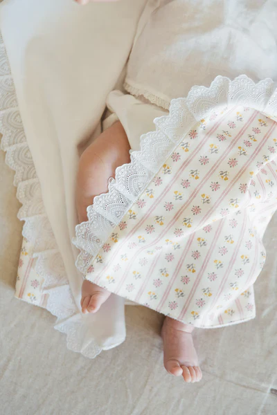 Arrullo de bebé confeccionado en coralina blanca con tira bordada de florecitas.