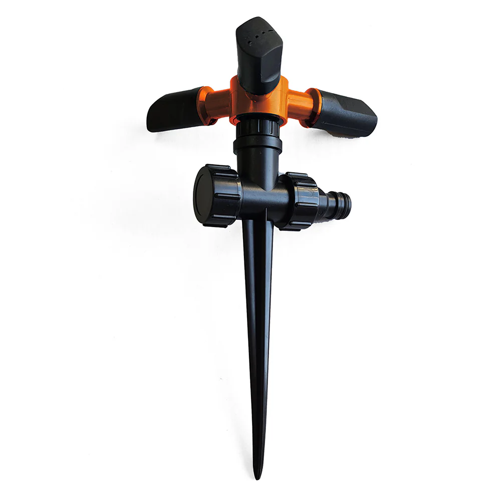 Aspersor rotativo de 3 brazos con pincho Orework para un riego homogéneo sin charcos. Funcionamiento sin mantenimiento, alta calidad y máxima durabilidad.