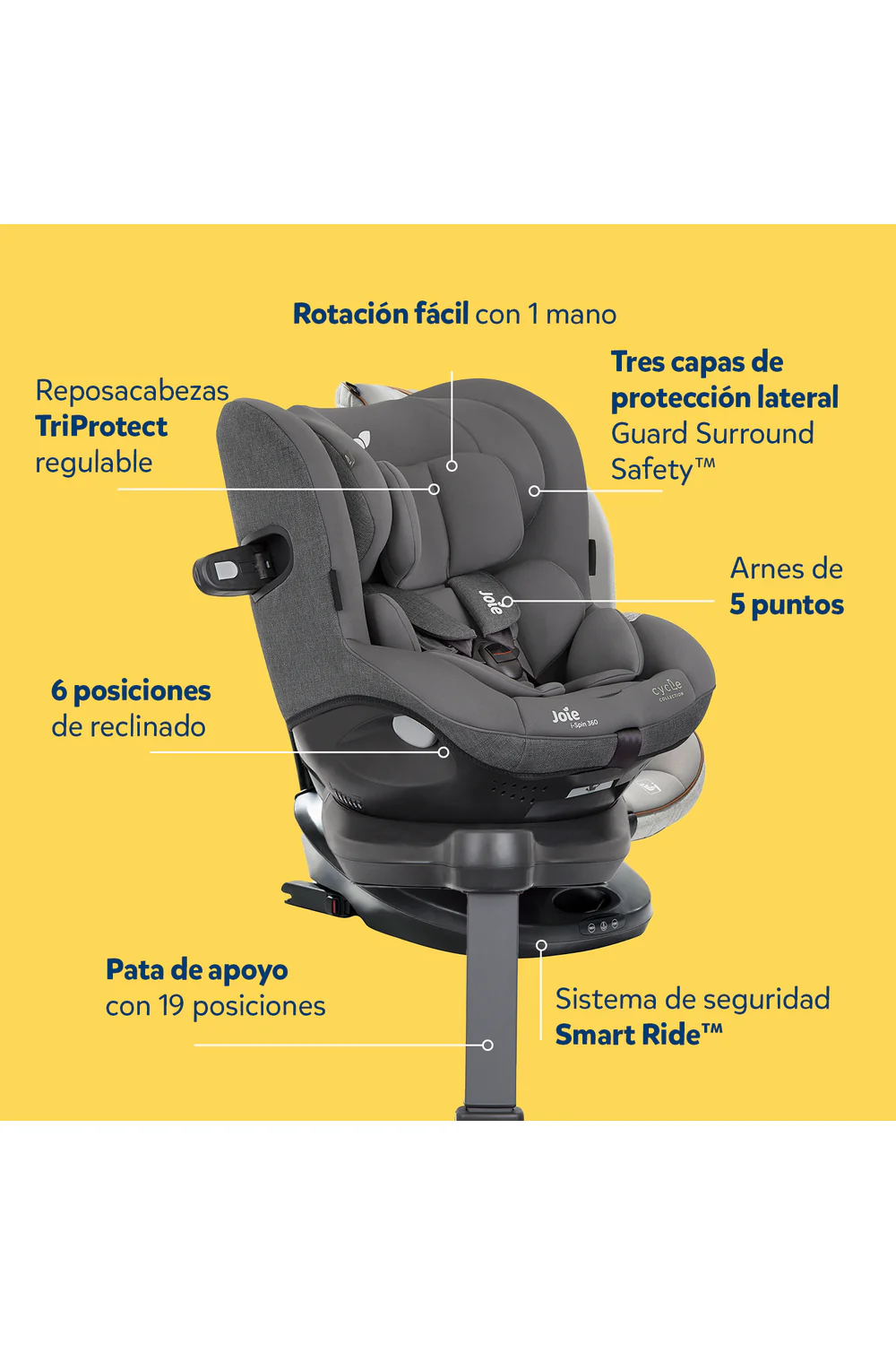 - Sistema de seguridad Smart Ride™ que permite mantener al bebé a contramarcha hasta que sea seguro girar en sentido de la marcha