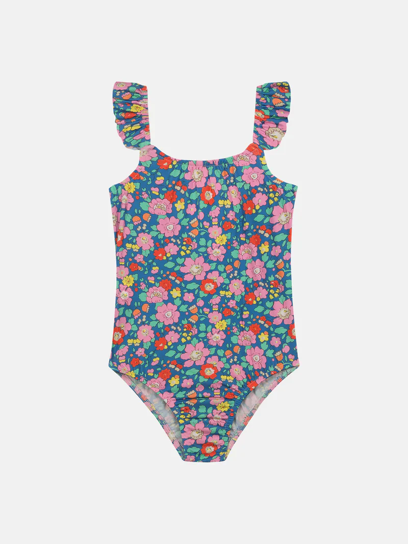 Bañador con volante en el tirante en 100% Lycra Liberty. Contemporáneo y muy elegante, destaca por sus volantes en los tirantes dándole un toque de elegancia atemporal, ¡a tus pequeñas les encantará!