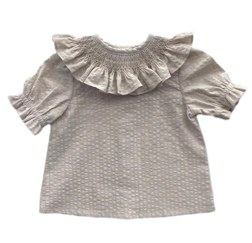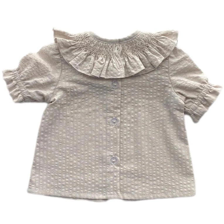 Blusa manga corta, tejido 100% algodón en beige, botones en la espalda y cuello con nido de abeja hecho a mano. Va a ser difícil que encuentres otra blusa tan práctica y que siente tan bien!