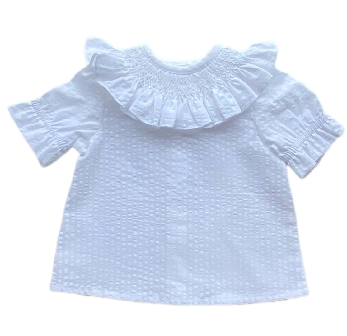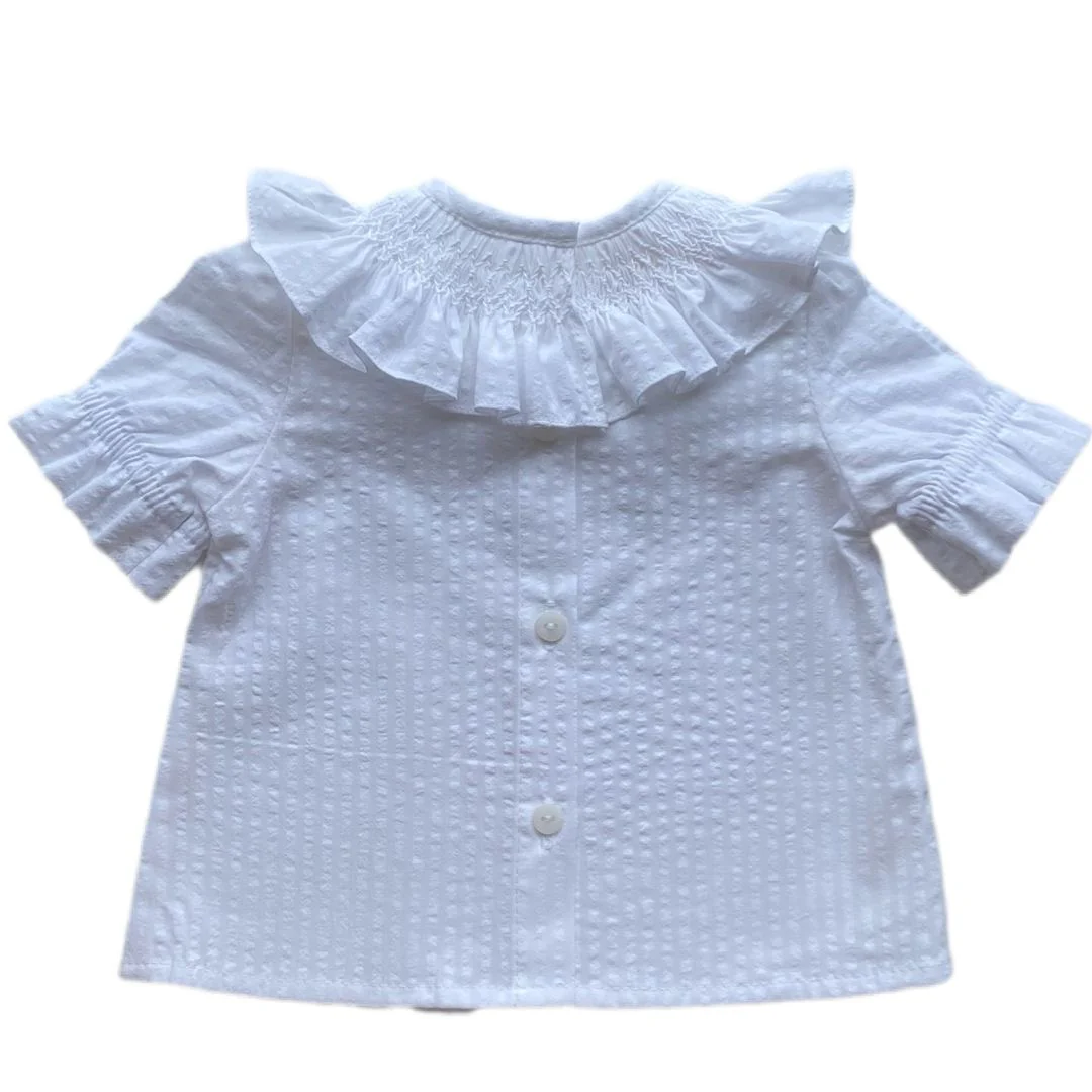 Blusa manga corta, tejido 100% algodón en blanco, botones en la espalda y cuello con nido de abeja hecho a mano. Va a ser difícil que encuentres otra blusa tan práctica y que siente tan bien!