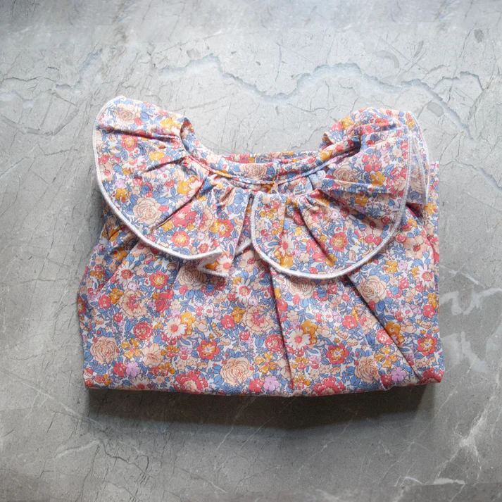 Blusa de manga larga en tejido liberty. Este modelo se caracteriza por su acabo en el cuello con forma de corazón y el vuelo que tiene en la caída. Se abotona completamente por la espalda.