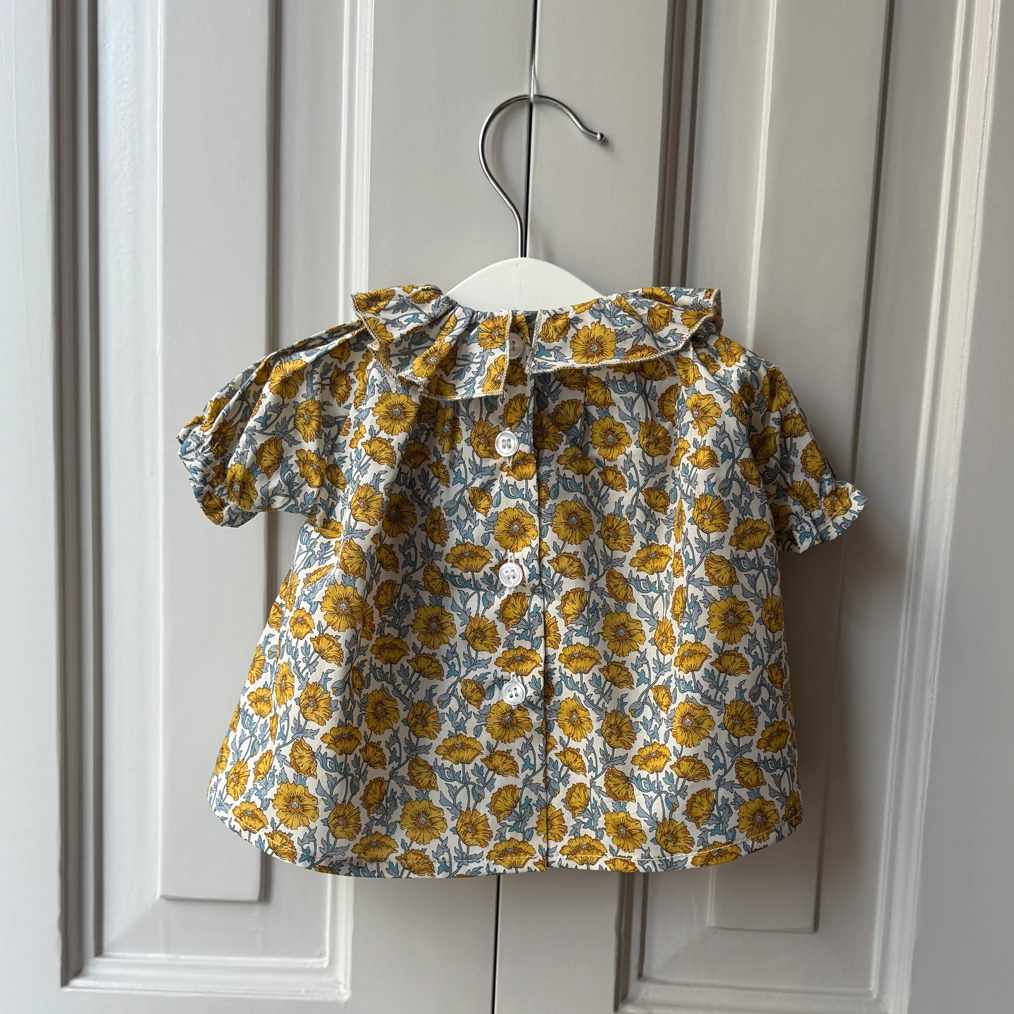 Blusa de manga corta con cuello en forma de corazón. Se abotona completamente por la espalda.