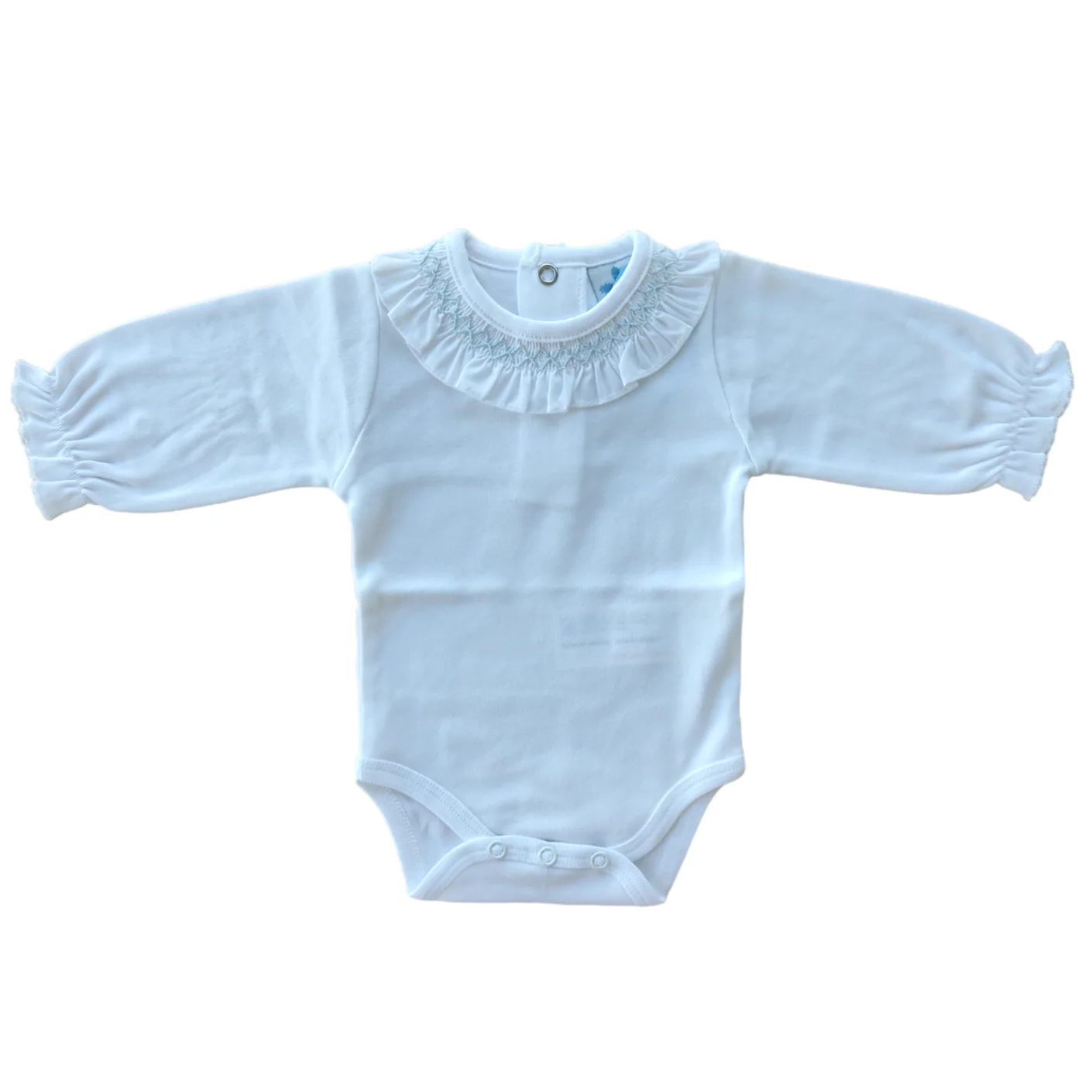 Body de manga larga con cuello smock, puños elásticos y automáticos en la entrepierna que facilitan la apertura y el cierre.