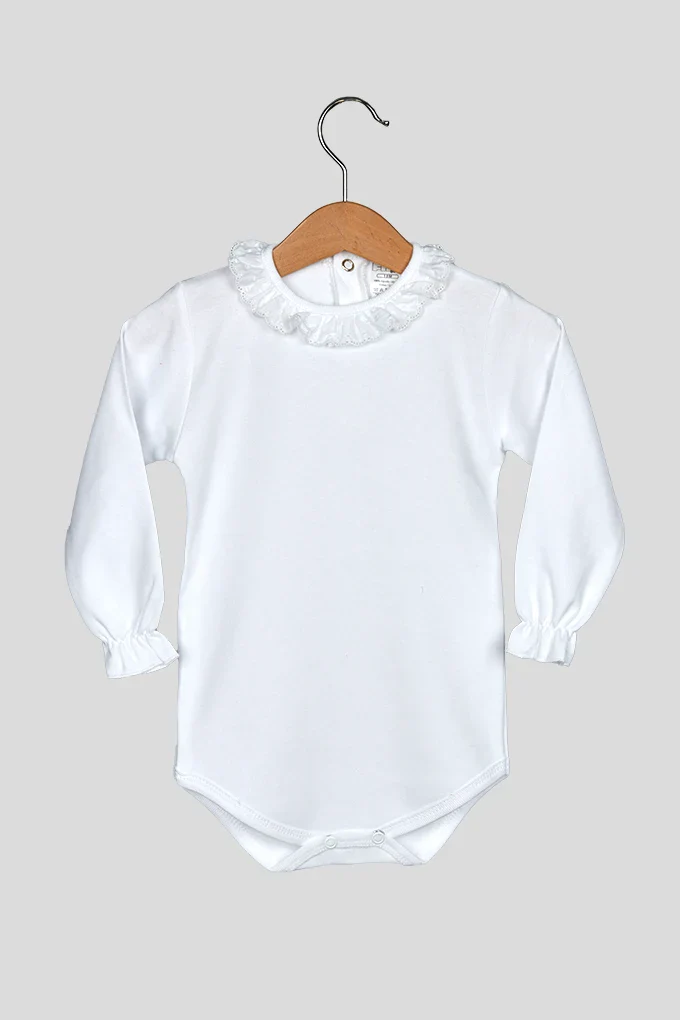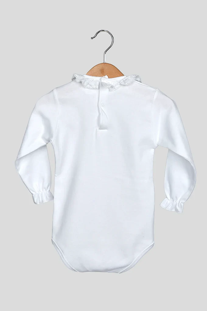 Body de manga larga con cuello con tira bordada y puños elásticos y automáticos en la entrepierna que facilitan la apertura y el cierre.