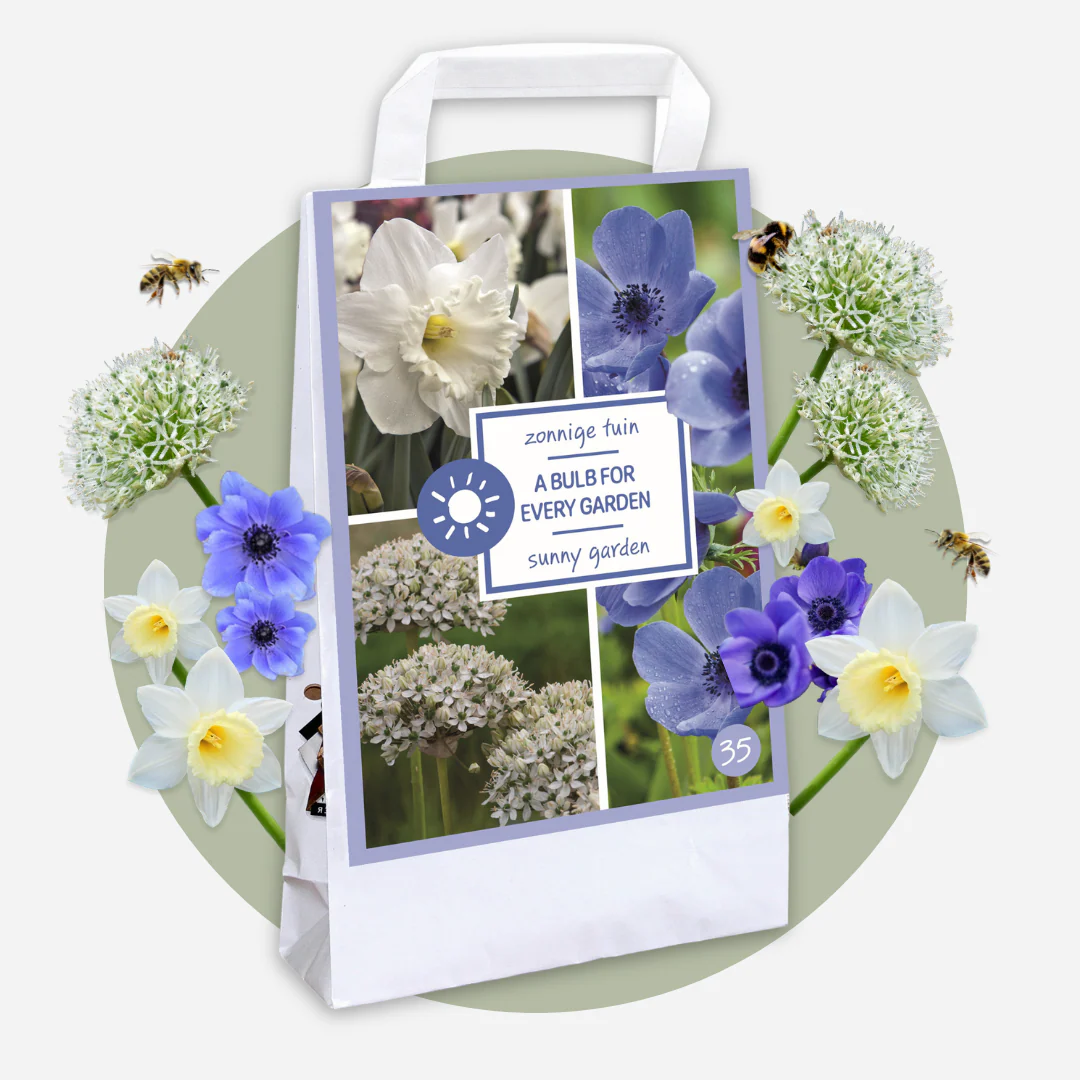 En la Caja Sunny Garden Box encontrarás 35 bulbos con una preciosa mezcla de variedades resistentes especialmente seleccionadas para zonas soleadas y luminosas. Esta combinación de bulbos proporciona un jardín primaveral colorido y natural que requiere poco mantenimiento. La mezcla ha sido cuidadosamente compuesta por expertos e incluye tres tipos de bulbos que prosperan en lugares soleados. Puedes plantar los bulbos entre septiembre y diciembre. De abril a junio disfrutarás de una floración natural y duradera perfecta para los rincones luminosos y soleados de tu jardín. La mezcla contiene: Anemone Coronaria Mr. Fokker (anémona azul oscuro) Allium Nigrum (cebolla ornamental blanca) y Narcissus Mount Hood (narciso blanco puro).
