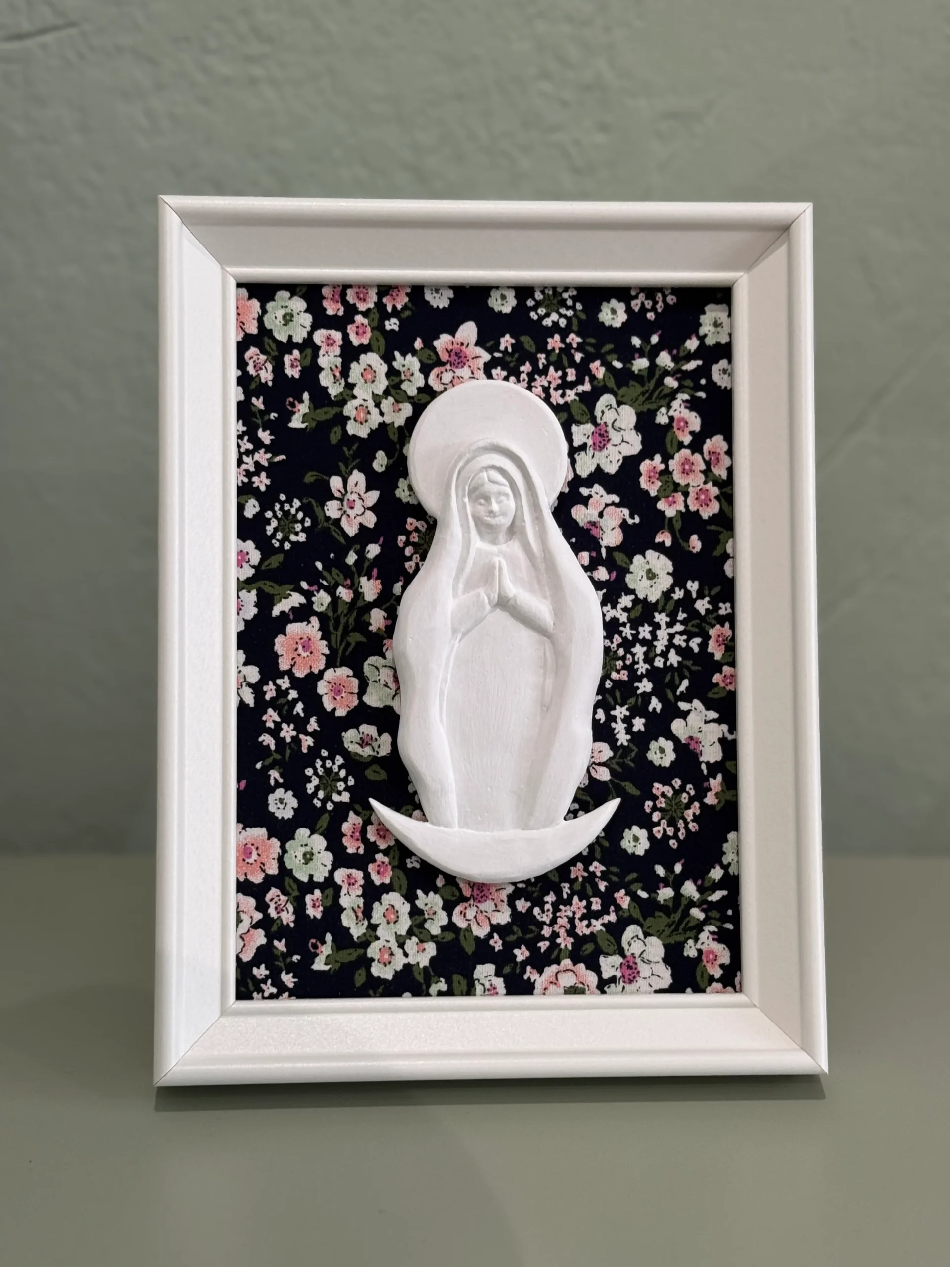 Este modelo tiene la base forrada en tela y encima nuestra cruz de yeso cerámico pintada en blanco a juego con el marco.