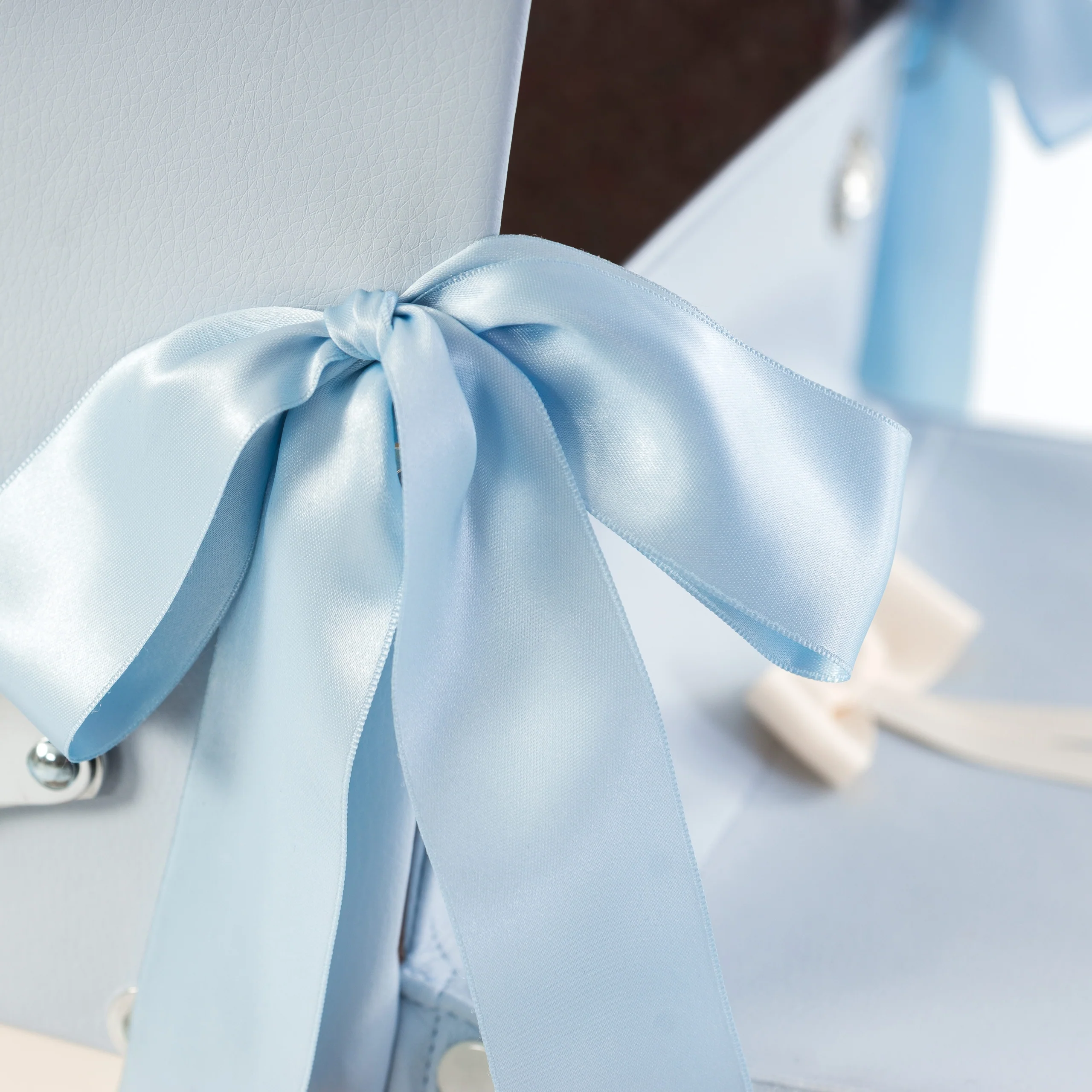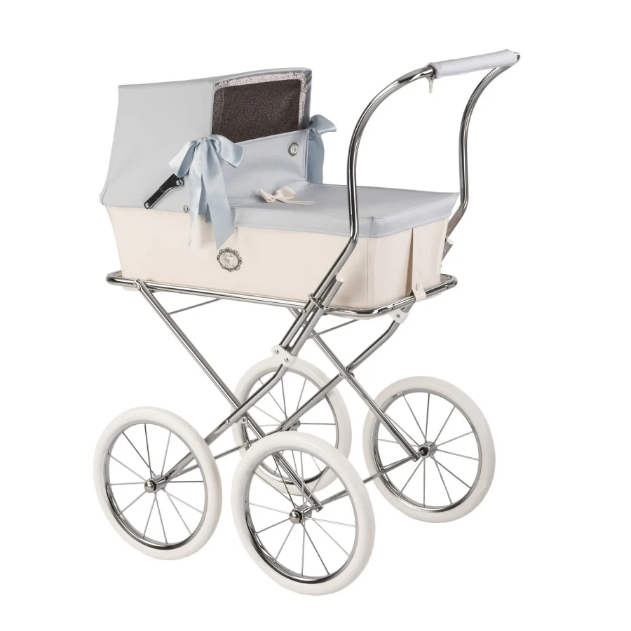 Incluye lazos de raso azul bebé para vestir la capota y lazo de grosgrain decorativo en cubrepiés.