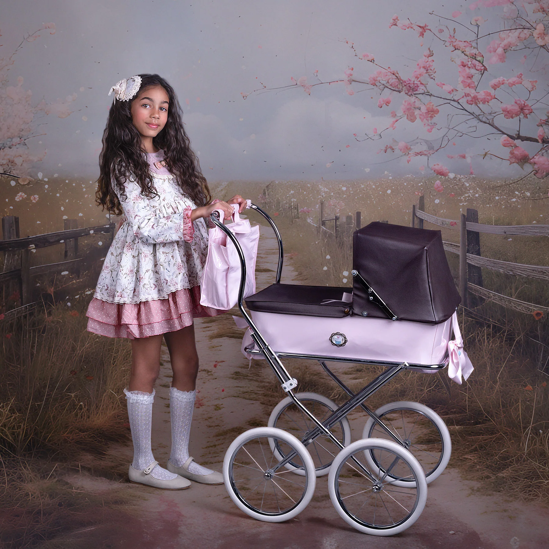 Incluye lazos de raso rosa para vestir la capota y lazo de grosgrain decorativo en cubrepiés.