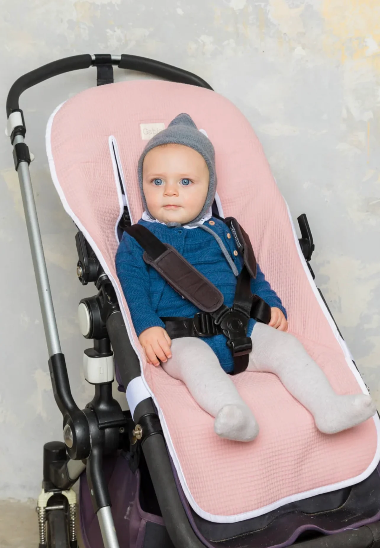 Funda para silla de paseo universal rosa. Se adapta a una gran variedad de modelos de carritos gracias a su diseño con amplias aberturas para los tirantes. Nuestras colchonetas para sillas de paseo cumplen una doble función: por un lado, están confeccionadas en algodón 100% y tejido 3D muy transpirable (mucho más agradable para el niño que los tejidos originales de las sillitas).