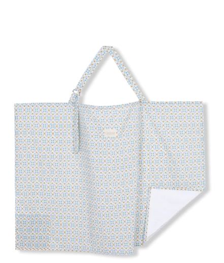 Con el delantal de lactancia o paño de lactancia podrás dar el pecho donde quieras con intimidad. Se ata al cuello con un tirante ajustable y tiene una ballena para que puedas ver a tu bebé y que no le caiga la tela directamente en la carita. Tiene un triángulo de toalla en cada esquina para limpiarle al bebé si se ensucia y un bolsillo para guardar el disco de lactancia o el chupete.