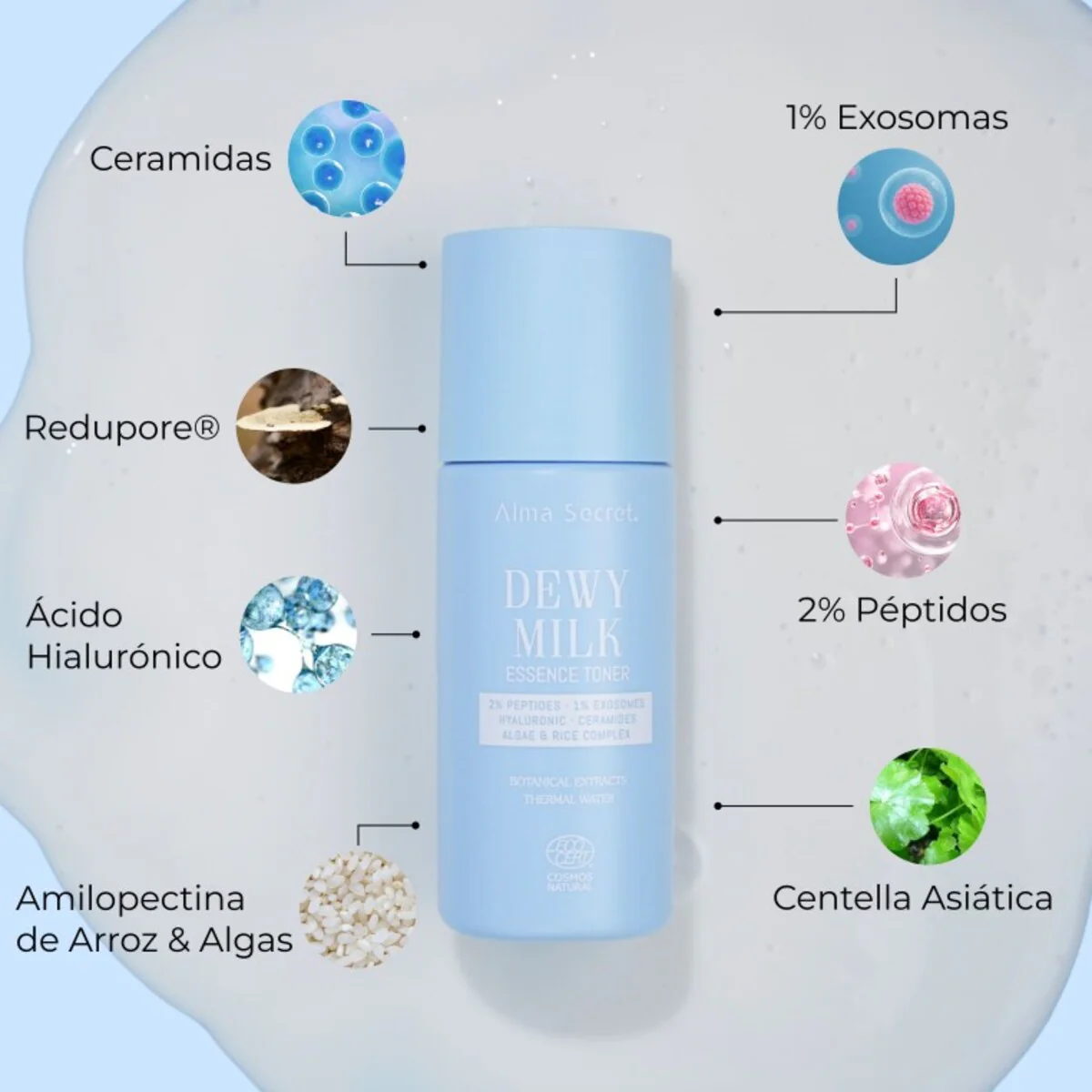 - Amilopectina de Arroz & Algas: tónico con un complejo de arroz y alga innovador que hidrata hasta 120 horas e incrementa la suavidad de la piel hasta un +26%, refuerza la barrera cutánea y potencia su resiliencia natural.
