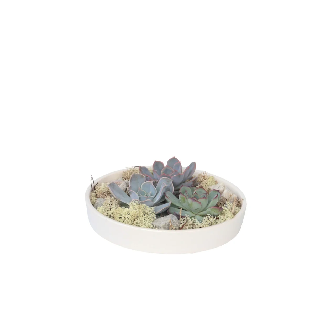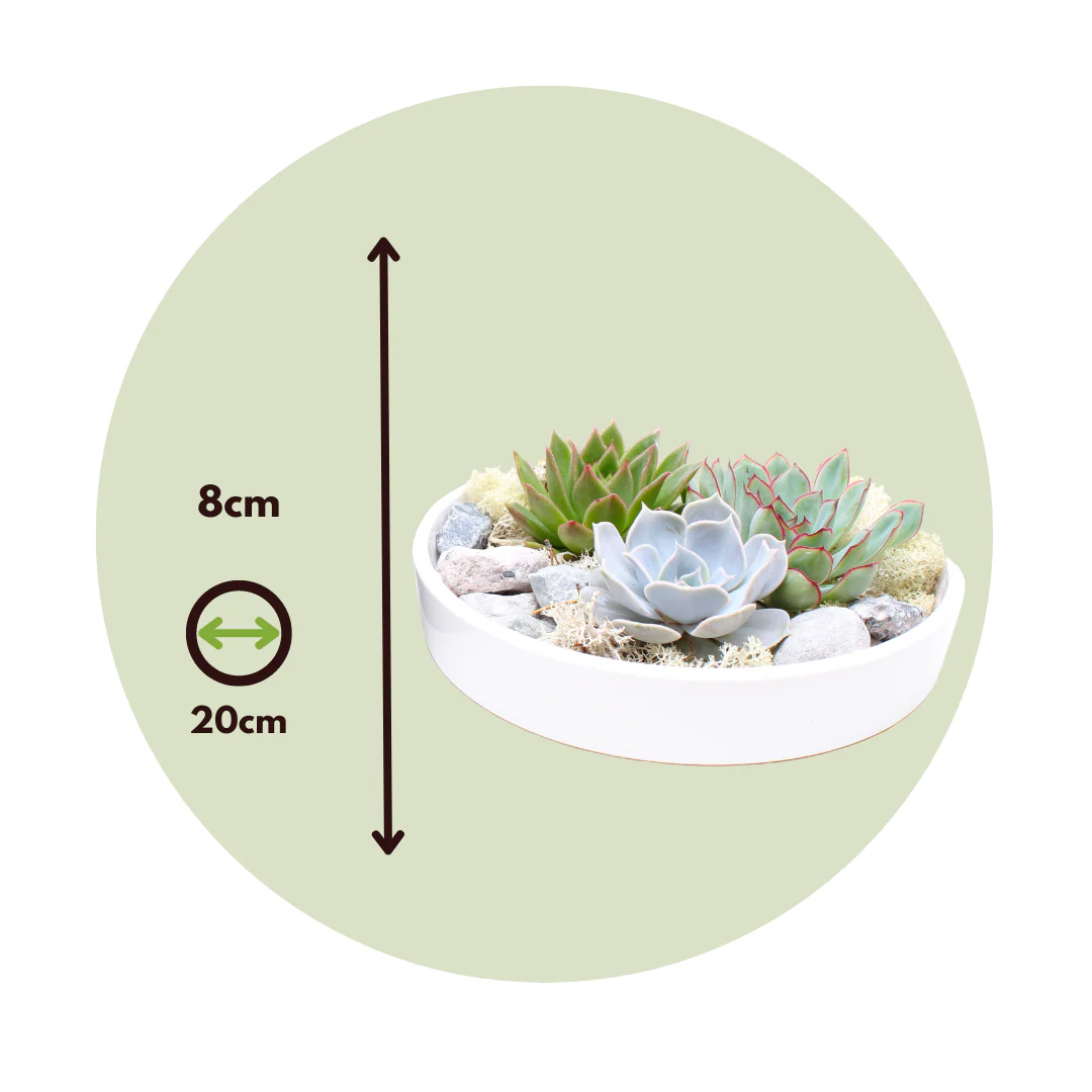 Estas suculentas ‘Desarraigada’ son una pieza especial de decoración para tu hogar. Son suculentas vivas pero al no tener raíces no necesitan estar en tierra. Esto hace que las suculentas Rootless sean perfectas para usar como una elegante decoración verde. Las suculentas Echeveria Garden Mix White vienen en un hermoso cuenco blanco con piedras decorativas completando al instante la decoración de tu mesa y añadiendo un toque exótico a tu interior. La suculenta Rootless puede estar sin agua durante meses ya que el agua se almacena en las hojas. Esto hace que las suculentas sean perfectas para las personas que desean la comodidad de las plantas en su hogar sin el cuidado que suele implicar.