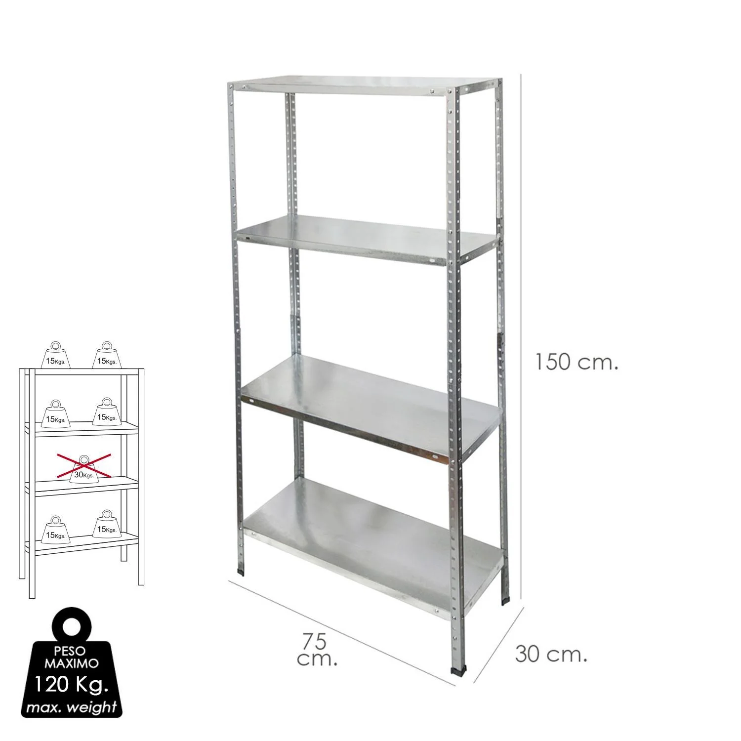 Modulo estanteria galvanizada- Medida: 150x75x30 cm.- 4 baldas (lejas) ajustables en tramos de 25 mm.- Peso máximo soportado por balda 30 Kg. El peso debe de estar distribuido a lo largo de la balda. Peso máximo soportado 120 kg.- Incluye tornillos de montaje.- Ideal para colocar en la cocina, el garaje, el lavadero, en la despensa, etc.