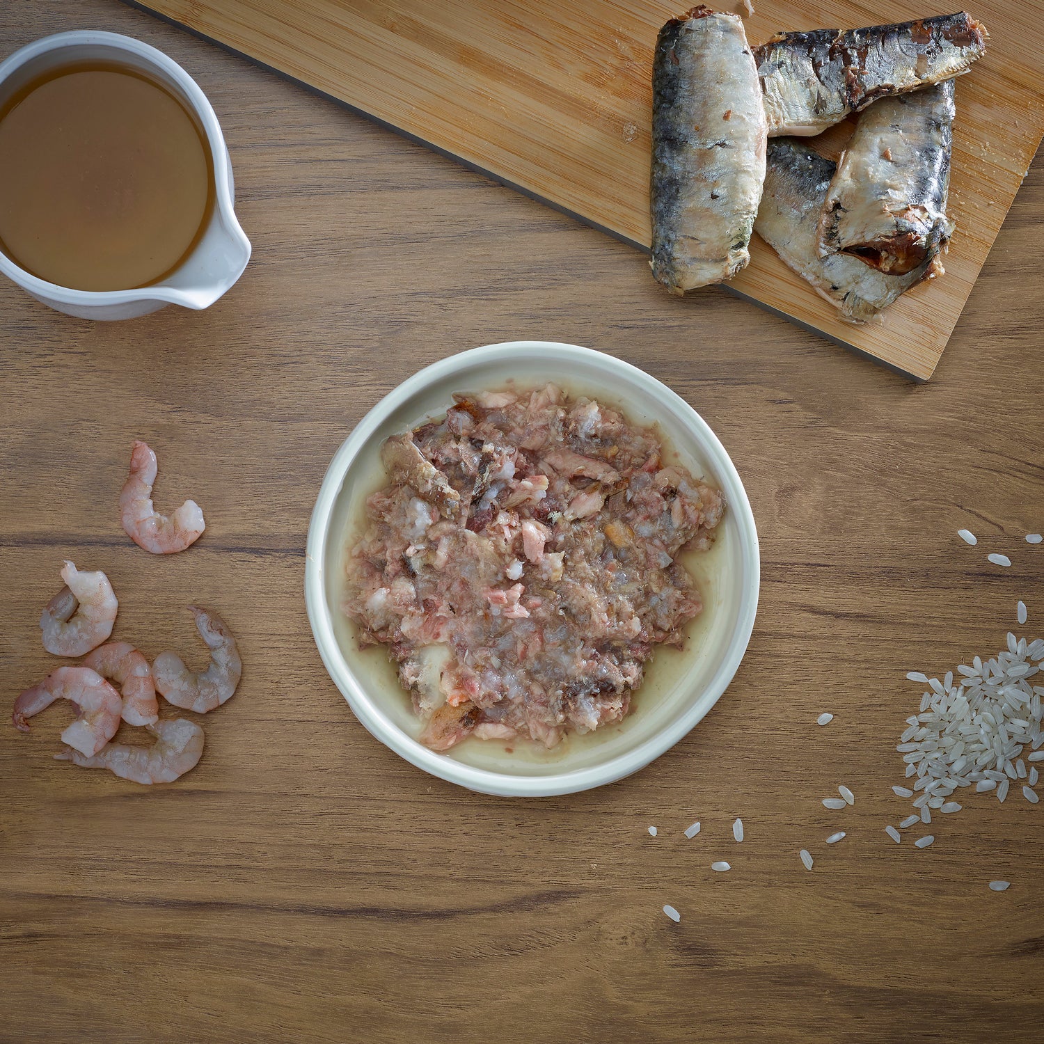 Sardina 65%, caldo de pescado 26%, camarón 5%, arroz 4%