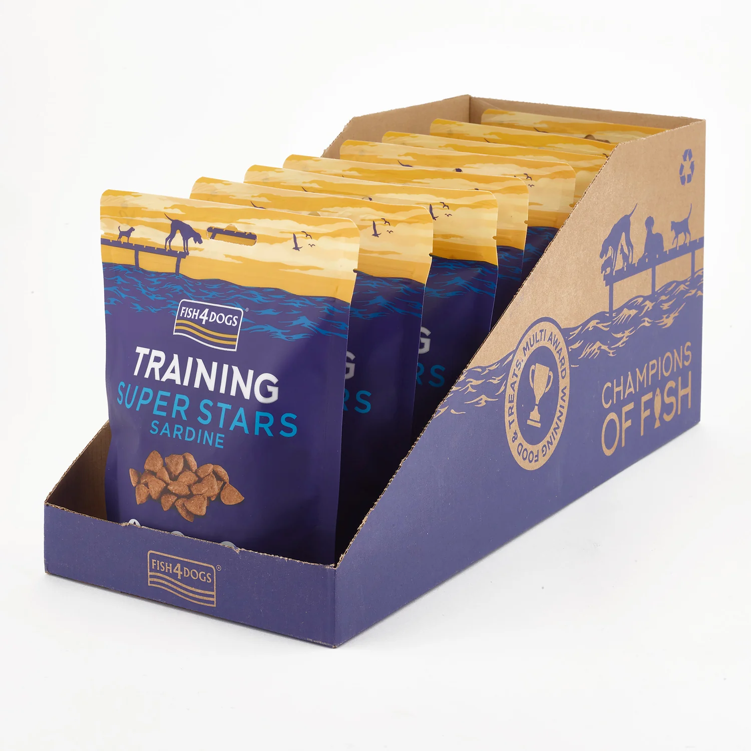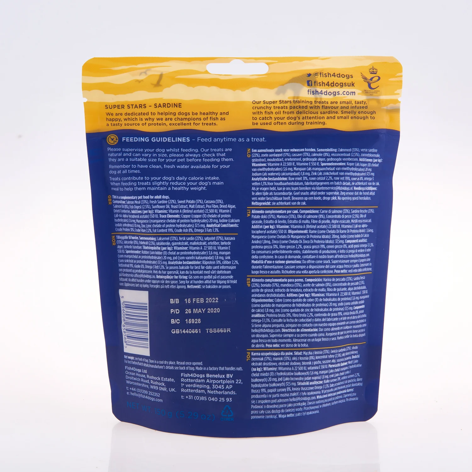 Los snacks Fish4Dogs Training Superstars Sardina son pequeños premios naturales ideales para reforzar el buen comportamiento. Con un alto contenido en pescado y un aroma irresistible, son fáciles de dispensar y no contienen cereales.