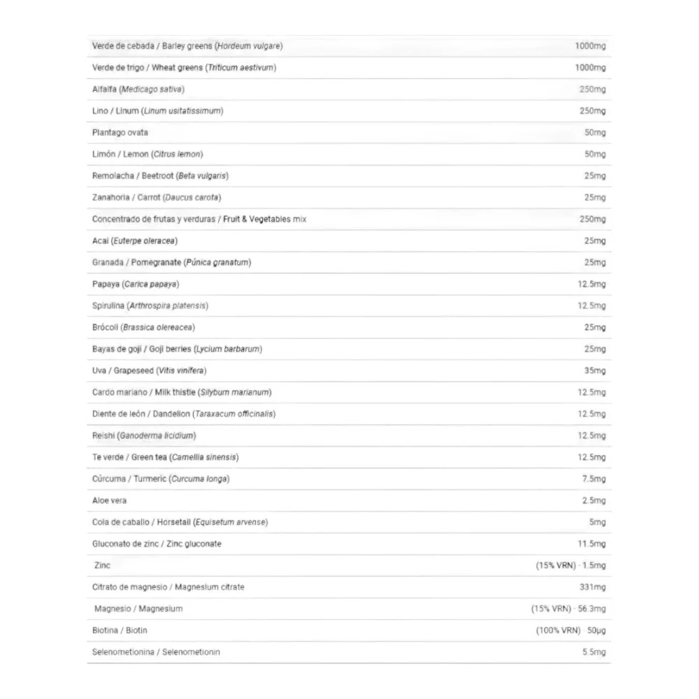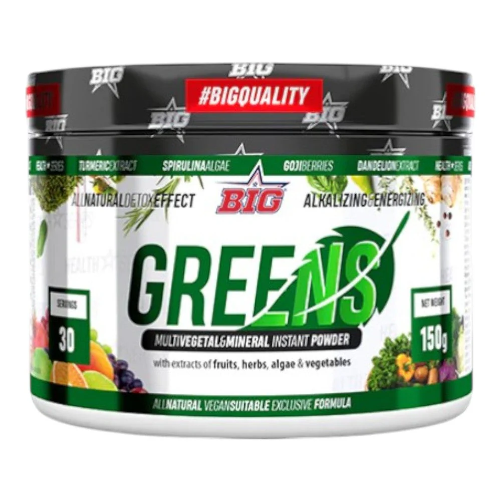 DescripciónGREENS de BIG® es una combinación de más de 50 extractos vegetales y minerales enfocada a la desintoxicación y normalización de nuestro sistema digestivo. Los elementos vegetales presentes en la formulación contienen fruta variada, verduras, extractos de hierbas, algas y verdes de cereales como el trigo, la cebada o la alfalfa.Entre los compuestos minerales encontramos zinc, magnesio o selenio, indispensables para el mantenimiento del sistema inmunológico y del tracto digestivo entre otras muchas cualidades, y cubriendo en muchos casos el 100% de la cantidad diaria recomendada para un adulto en la dosis indicada.Beneficios:Principales beneficios de Greens de la gama Big Nutrition: – La fórmula verde con más de 50 extractos vegetales y minerales. – Diseñado para optimizar la desintoxicación y normalización de nuestro sistema digestivo.- Con fruta variada, verduras, extractos de hierbas y algas. – Con verde de cereales como el trigo, la cebada o la alfalfa.- Con minerales como zinc, magnesio o selenio.- Ayuda al mantenimiento del sistema inmunológico y del tracto digestivo. – 30 dosis por envase. IngredientesPolidextrosa, Verdes de cebada (Hordeum vulgare) y trigo (Triticum aestivum), Citrato de magnesio (17% magnesio), Alfalfa (Medicago sativa), Semillas de lino (Linum usitatissimum), Concentrado de frutas y verduras: (pimiento, jengibre, brócoli, espinacas, col rizada, col, té verde, frambuesa, plátano, kiwi, mango, ciruela, lima, arándano, piña, naranja, pomelo rosa, cereza, limón, coliflor, hierba de trigo, alfalfa, espirulina, chlorella), Inulina y oligofructosa, Plantago ovata, Limón (Citrus limonun), Semilla de uva (Vitis vinífera), Remolacha (Beta vulgaris), Zanahoria (Daucus carota), Acai (Euterpe oleracea), Granada (Púnica granatum), Brócoli (Brassica oleracea), Goji (Lycium barbarum), Papaya (Carica papaya), Spirulina (Arthrospira platensis), Té verde (Camellia sinensis), Cardo mariano (Silybum marianum), Diente de león (Taraxacum officinalis), Reishi (Ganoderma licidium), Gluconato de zinc (13% zinc), Cúrcuma (Curcuma longa), Selenometionina, Cola de caballo (Equisetum arvense), Aloe vera, Biotina (D-Biotina).Puede contener trazas de gluten, leche, huevo, soja, pescado y crustáceos. Una vez abierto, conservar en un lugar fresco y seco.Modo de empleoCualquier hora es buena para tomar GREENS, aunque será más efectivo si lo tomas por la mañana junto al desayunoPresentaciónEnvase de 150 gramos.