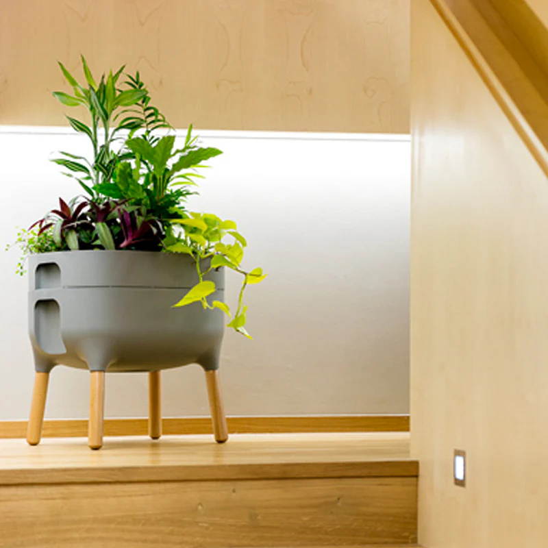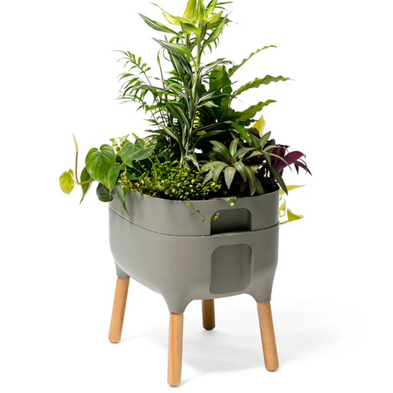 La jardinera con patas cortas y sistema de auto-riego URBALIVE Low está formada por 2 bandejas superpuestas con 4 patas de madera (FSC). Estas jardineras son ideales para su uso en interiores, oficinas, zonas de paso, balcones, terrazas y patios. Su diseño elevado permite un fácil acceso al cultivo de plantas decorativas, aromáticas u hortalizas. La bandeja inferior actúa de reservorio de agua y a través de una cinta alimenta de agua el sustrato que hay en la bandeja superior, facilitando el agua necesaria para la planta.