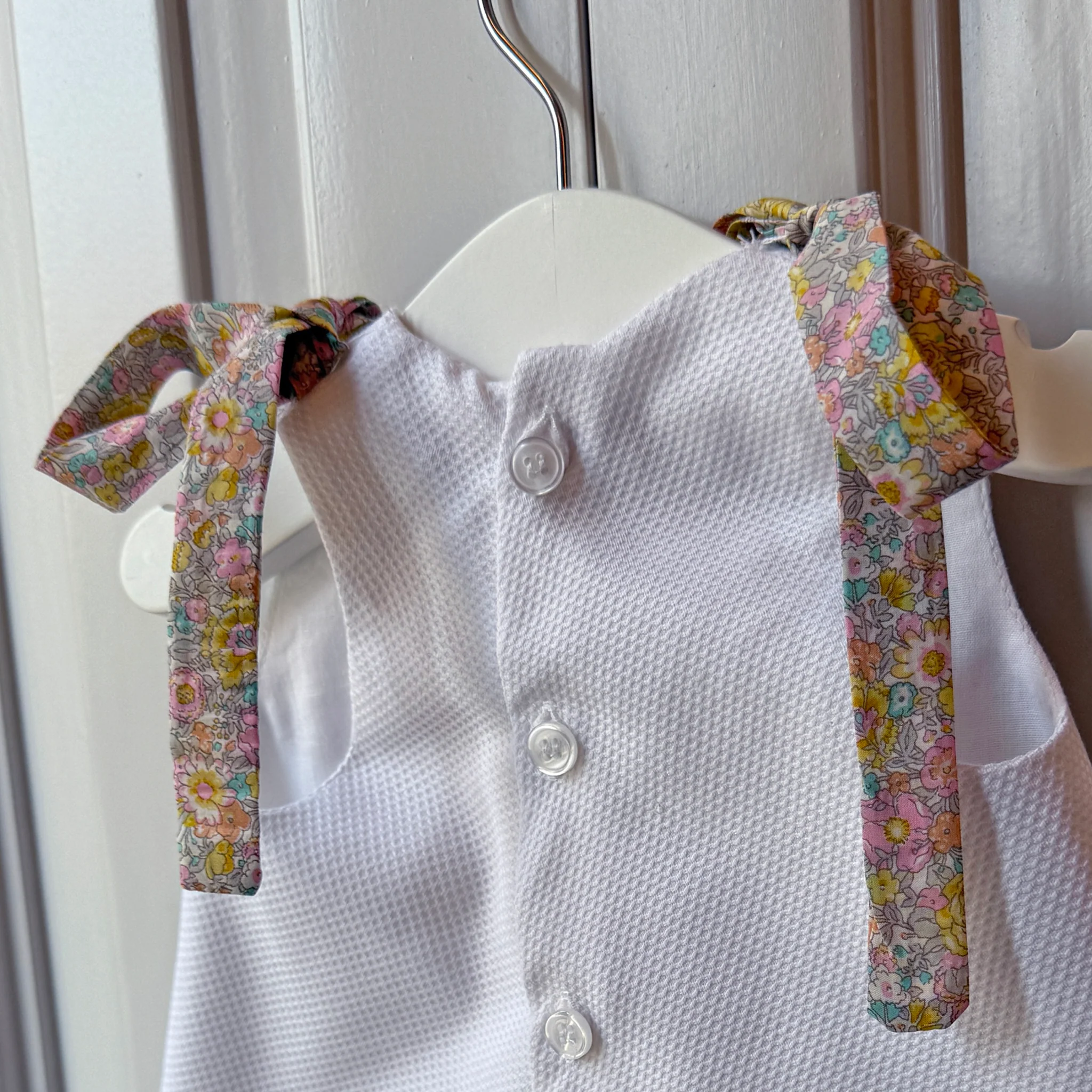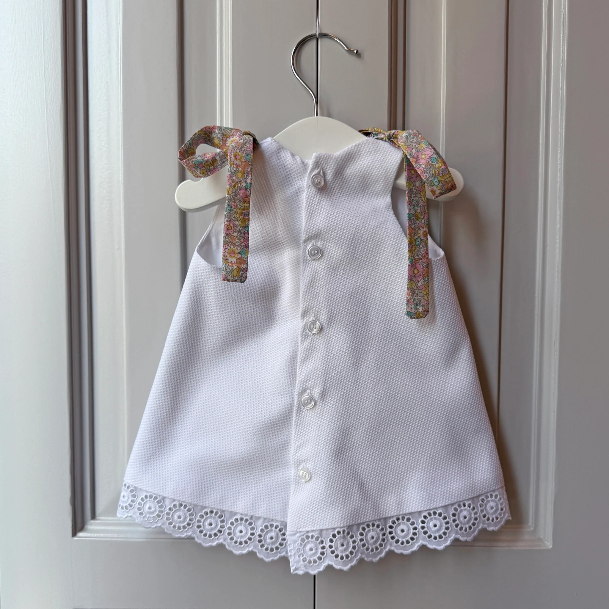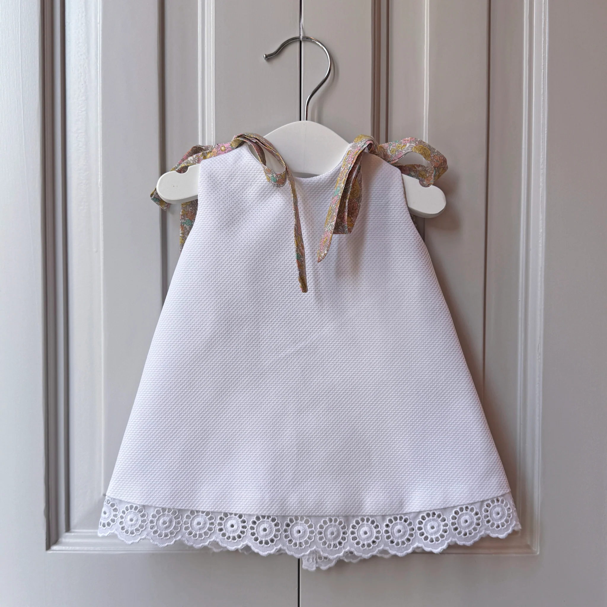 Vestido sin mangas y puntilla en el bajo con braguita a juego. Nuevo modelo en nuestra colección de clásicos de bebé. Los lazos son extraibles para poder cambiarlos o incluso llevarlo sin ellos. Es una prenda ligera y cómoda con la que no pasarán calor y que puede complementarse con un jersey los días más fríos.