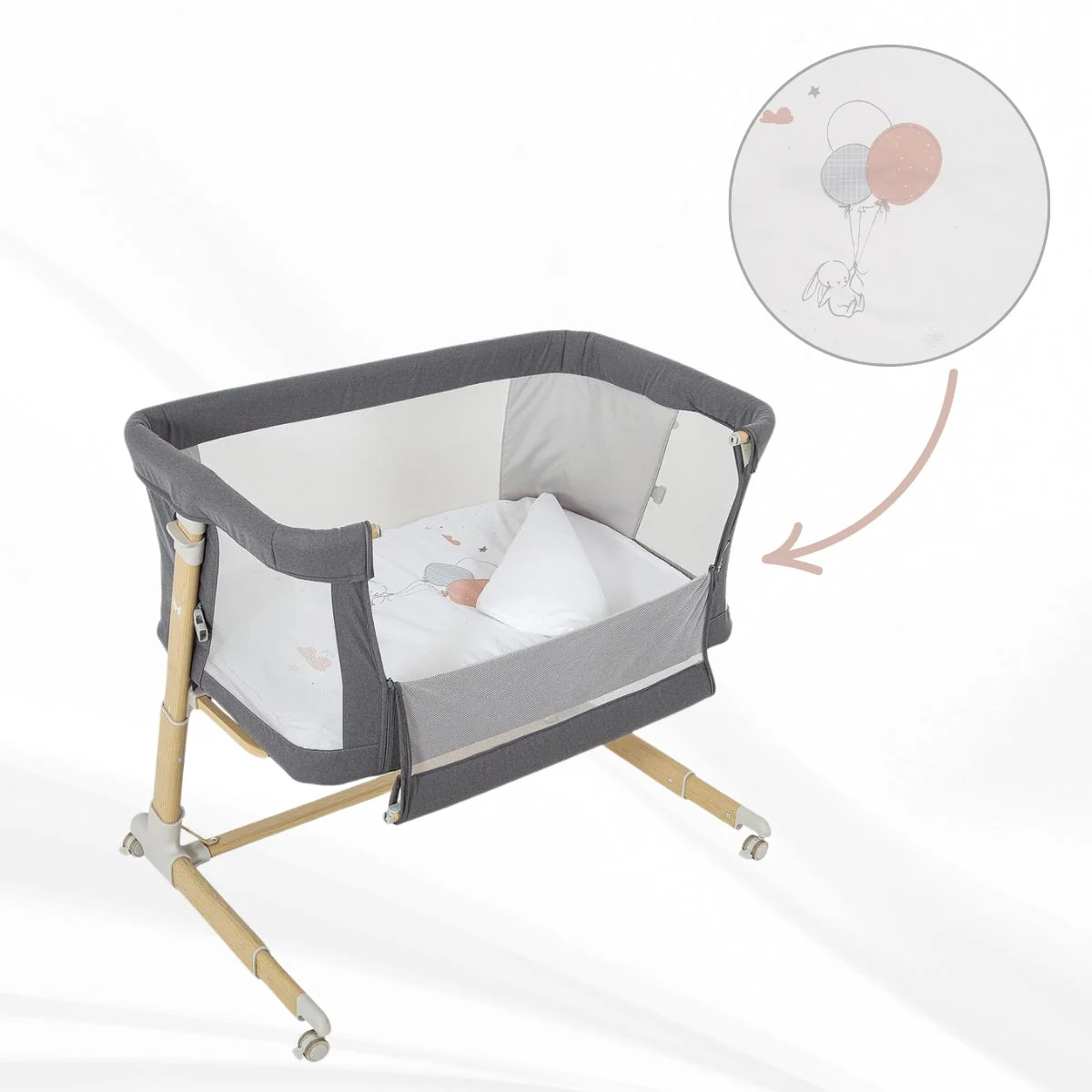 Con 6 posiciones de altura (de 44 a 56 cm), la minicuna Jolie se ajusta perfectamente a la cama de los padres, haciendo que el colecho sea más seguro y cómodo. La ventana lateral de rejilla con cremallera mejora la transpirabilidad y permite mantener el contacto visual con tu peque mientras duerme, reforzando el vínculo y facilitando las tomas nocturnas. Además, sus ruedas con freno te permiten moverla con facilidad por la casa sin perder estabilidad.
