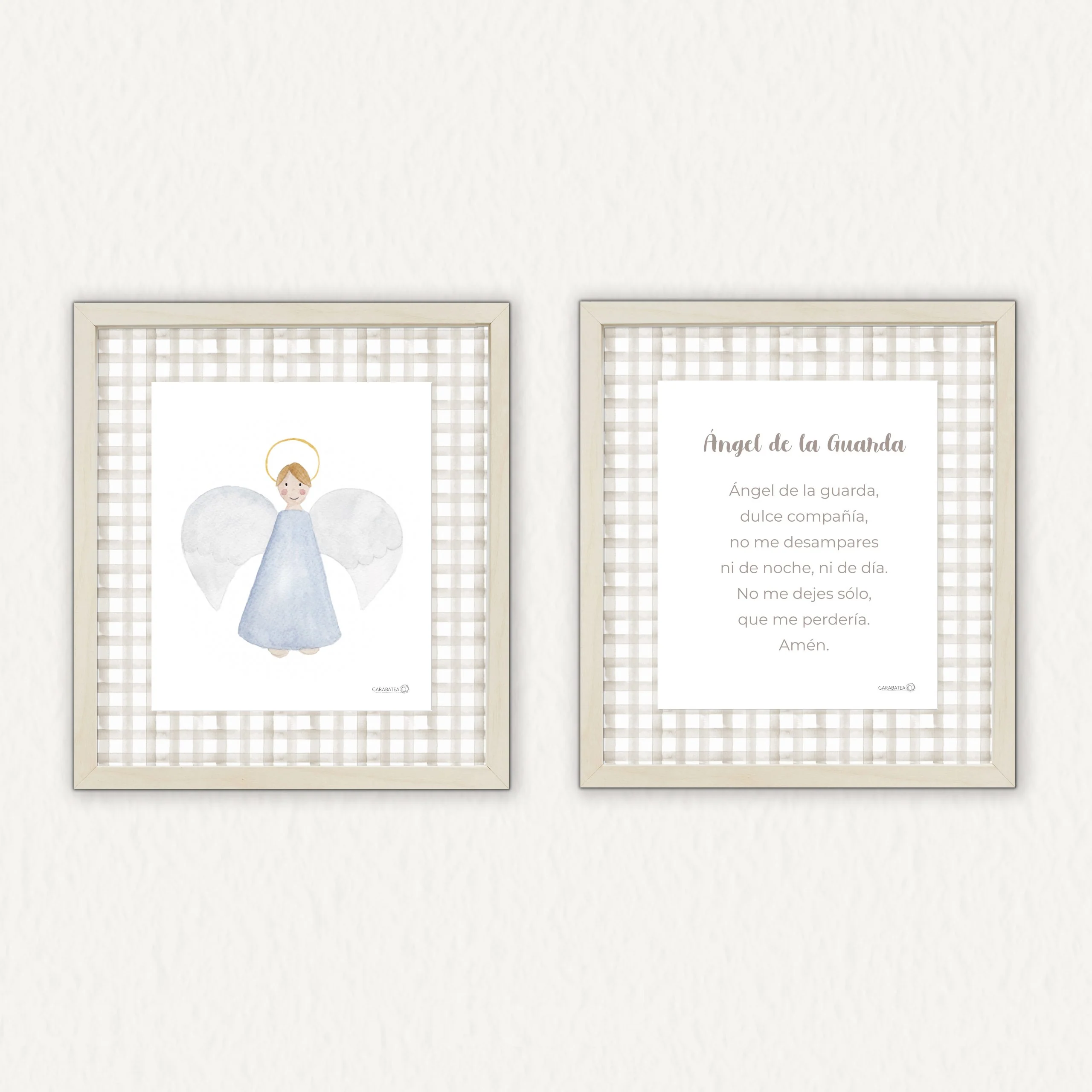 Esta lámina con nuestra simpática angelita hace pareja con la oración del Ángel de la Guarda del mismo color, ambas decoradas al rededor con una franja de cuadros vichy, ideal para decorar una habitación infantil. Disponible en varios colores diferentes.