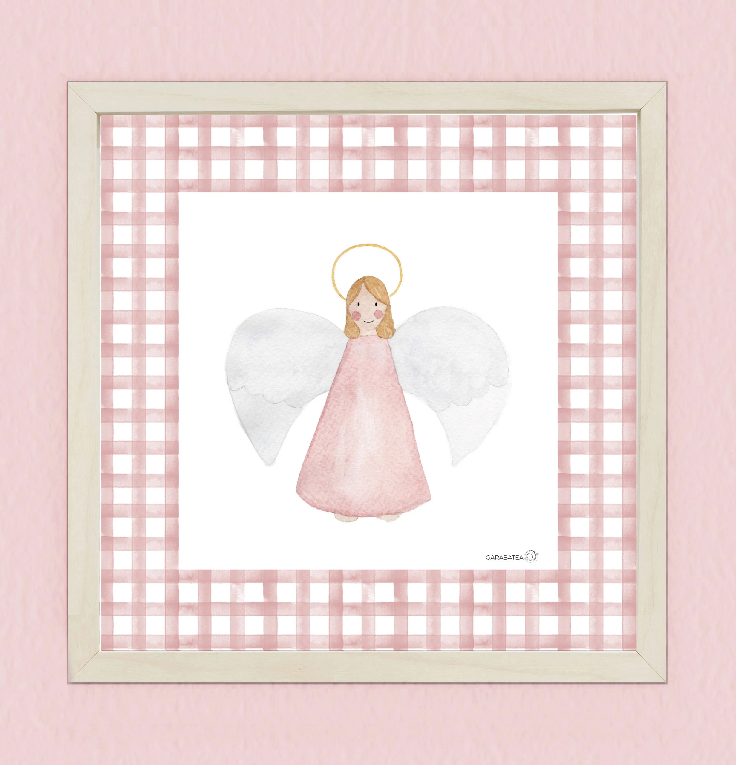 Esta lámina con nuestra simpática angelita hace pareja con la oración del Ángel de la Guarda del mismo color, ambas decoradas al rededor con una franja de cuadros vichy, ideal para decorar una habitación infantil. Disponible en varios colores diferentes.