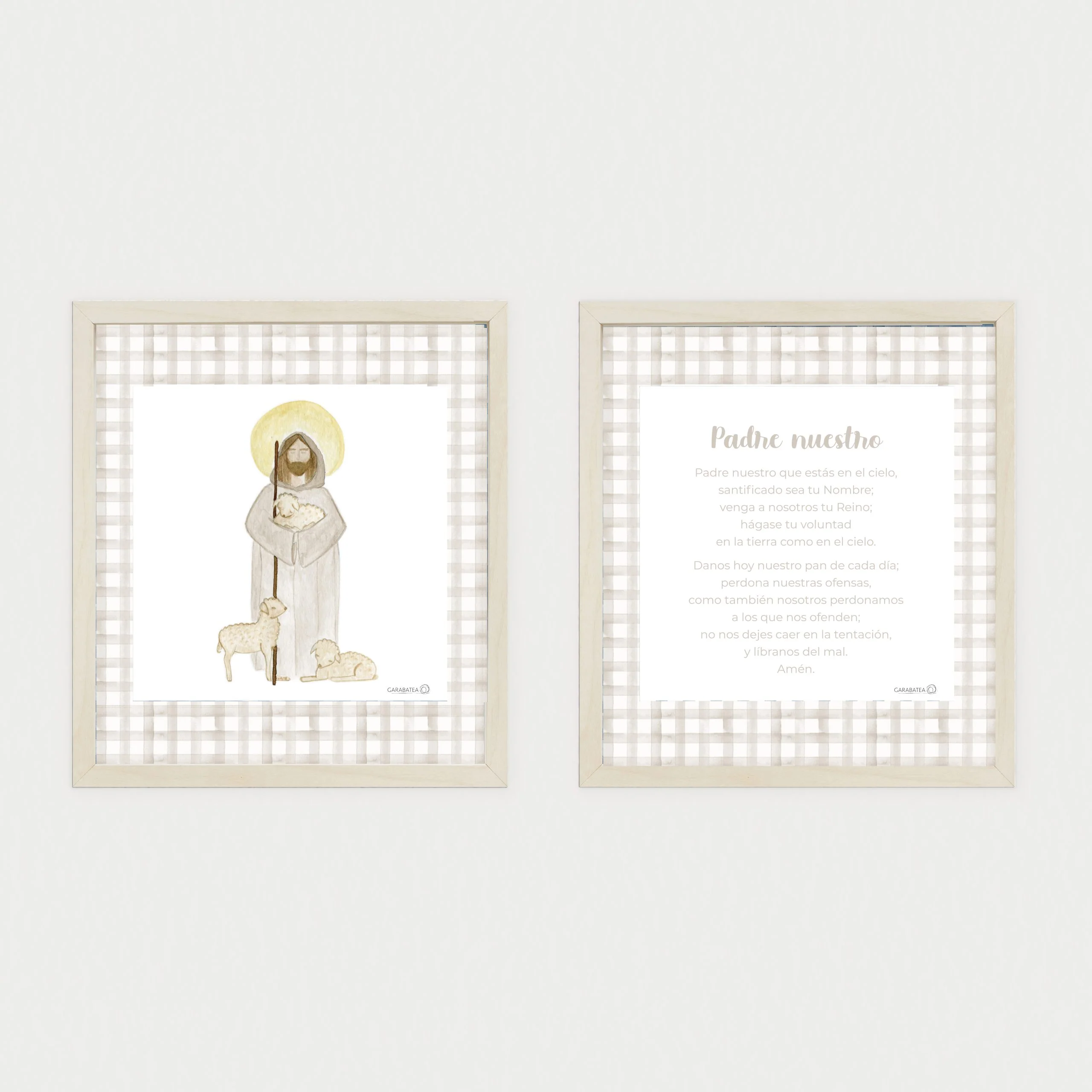 Esta lámina con nuestro Buen Pastor hace pareja con la oración Padre Nuestro del mismo color, ambas decoradas al rededor con una franja de cuadros vichy, ideal para decorar una habitación infantil. Disponible en varios colores diferentes.