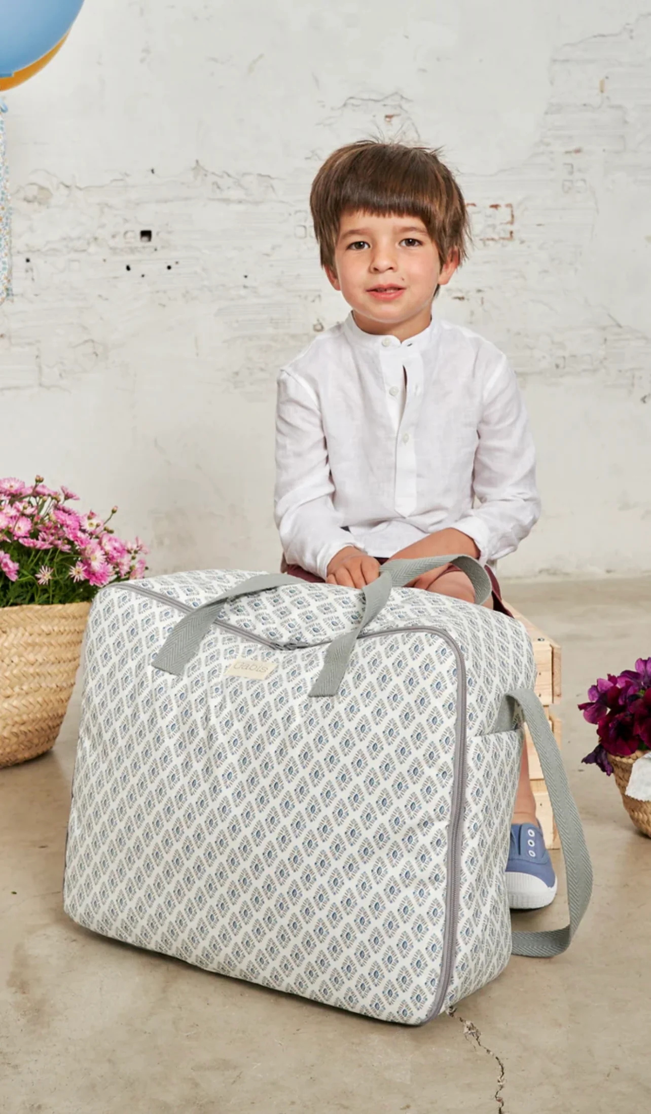 Maleta de maternidad en nuestro estampado exclusivo Antón de rombos azules y grises sobre fondo blanco. Acabado 100% impermeable. Es un estampado muy dulce, suave y fresquito, perfecto para bebés y niños pequeños.