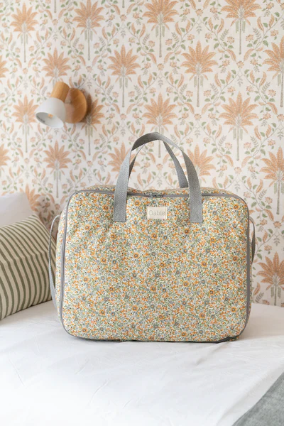 Maleta de maternidad en nuestro estampado Jaime de flores azules y mostaza con hojas verdes, sobre fondo blanco. Acabado 100% impermeable. Es un estampado muy dulce, suave y fresquito, totalmente unisex, perfecto para bebés y niños pequeños.