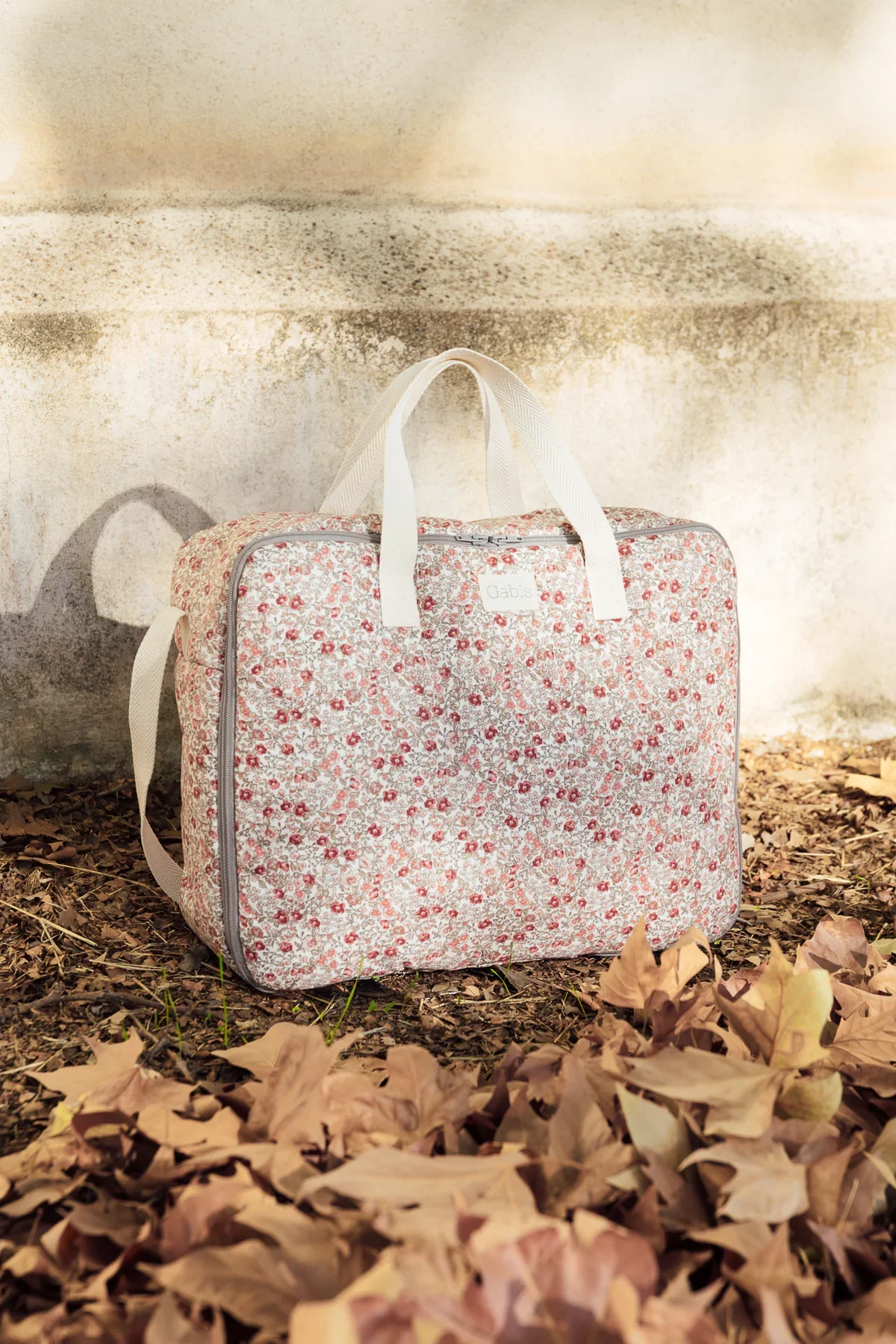 Maleta de maternidad en nuestro estampado exclusivo Jimena de flores rositas y granates con hojas verdes, sobre fondo blanco. Acabado 100% impermeable. Es un estampado muy dulce, suave y fresquito, perfecto para bebés y niños pequeños.