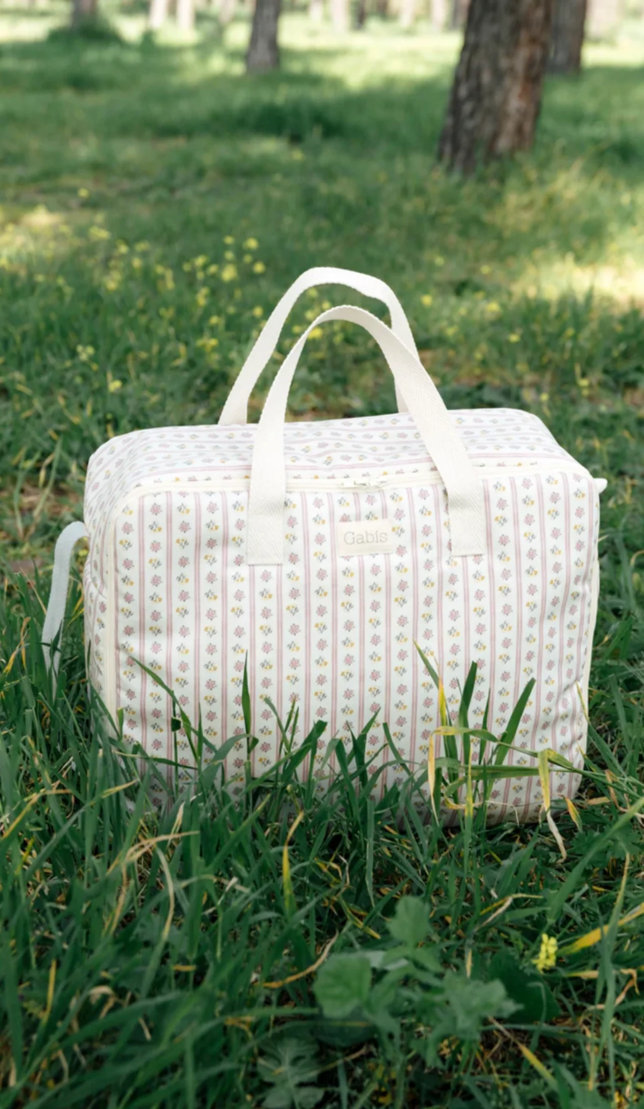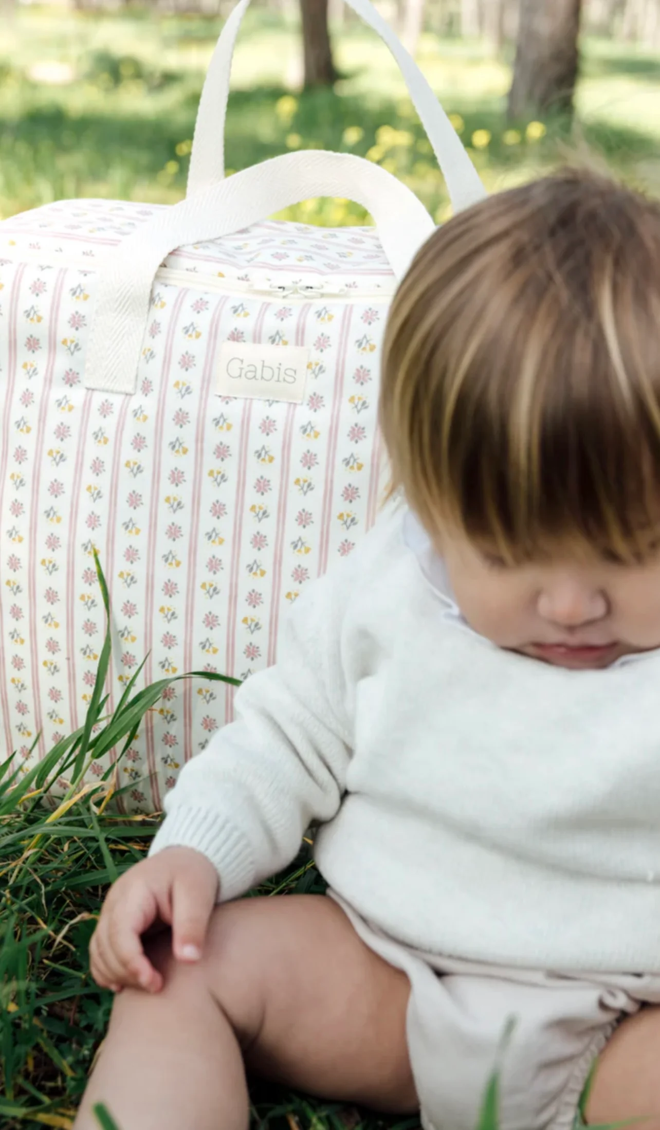 Maleta de maternidad en nuestro estampado exclusivo Micaela de exclusivas rayas rosas con flores rosas, mostazas y grises.. Acabado 100% impermeable. Es un estampado muy dulce, suave y fresquito, perfecto para bebés y niños pequeños.