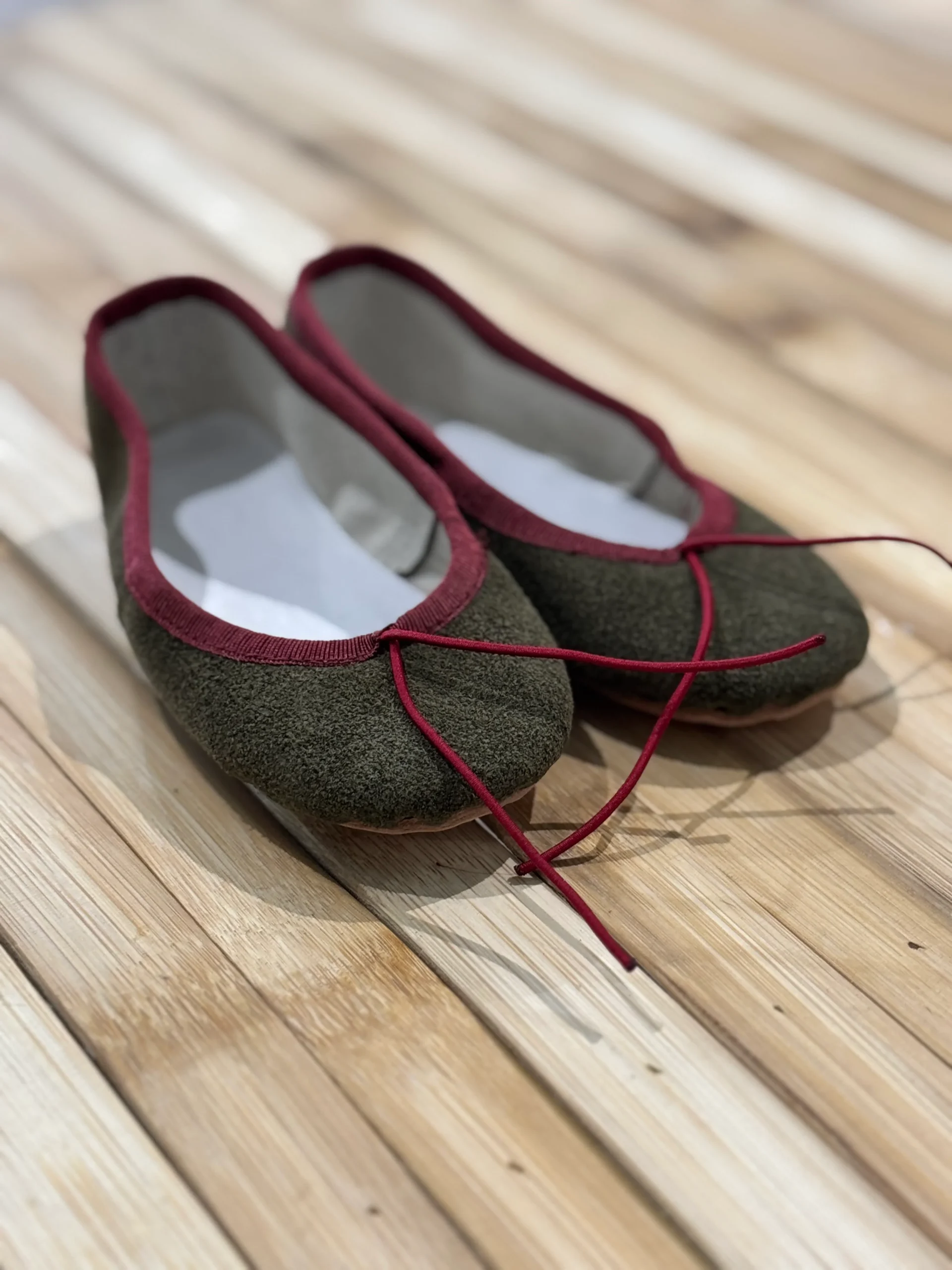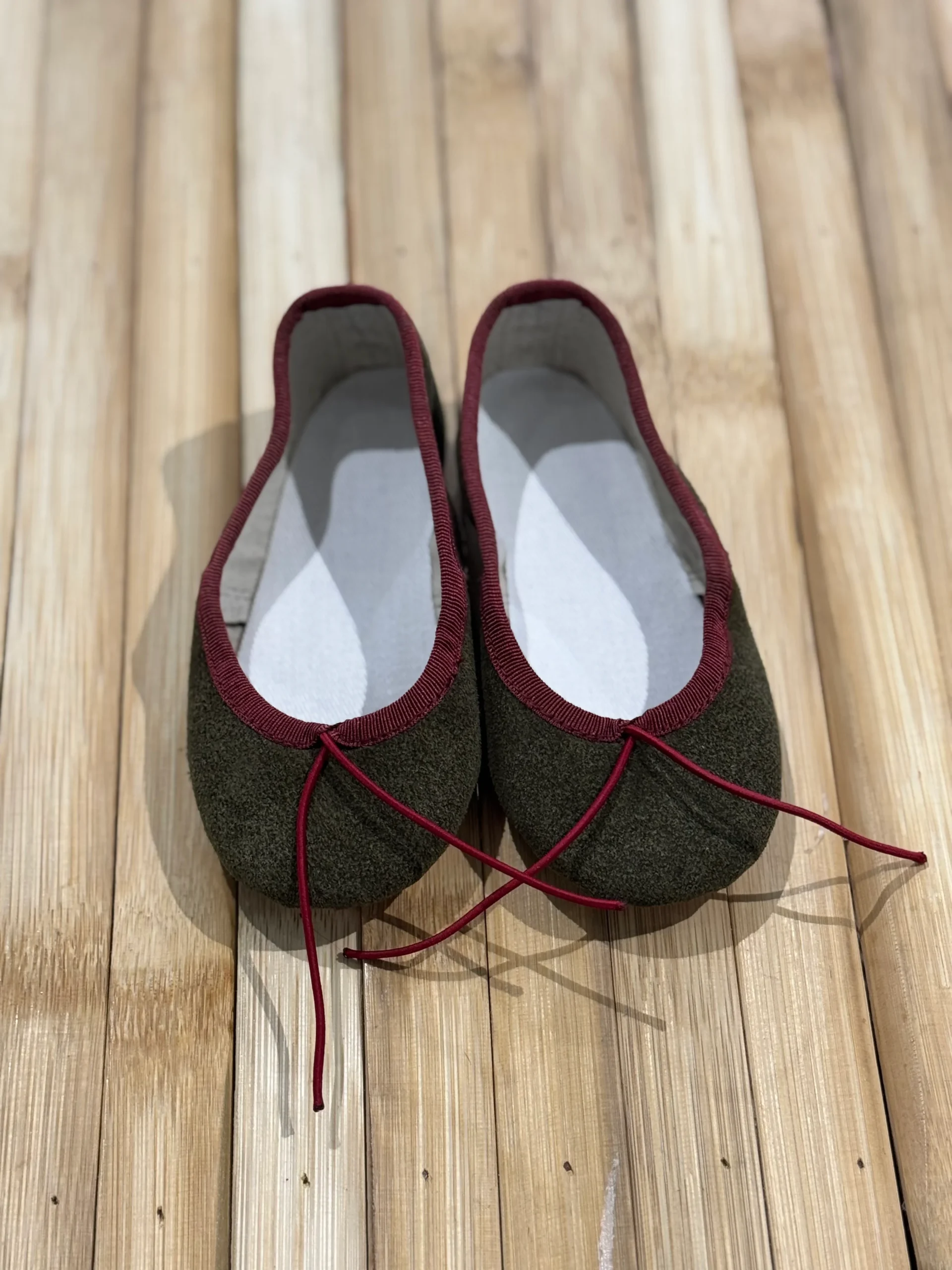 Sé el primero en valorar “Manoletinas serraje verde musgo ribete burdeos”