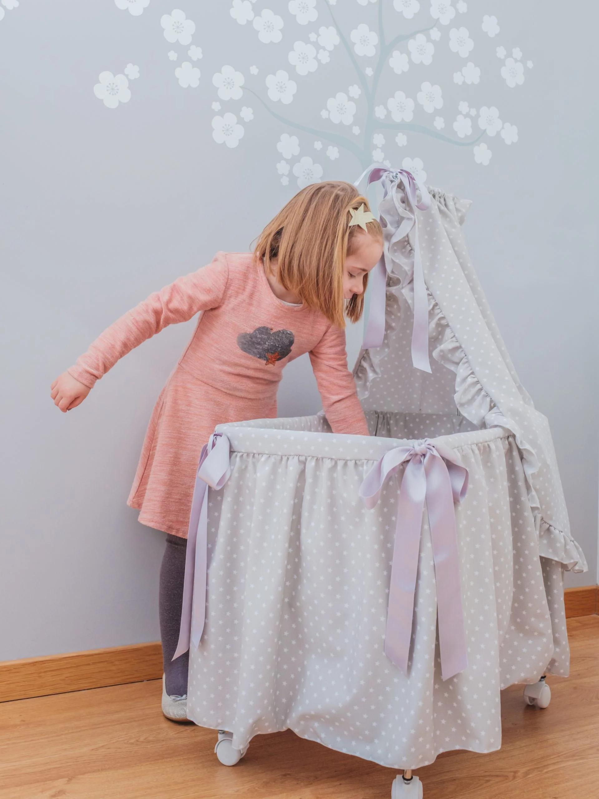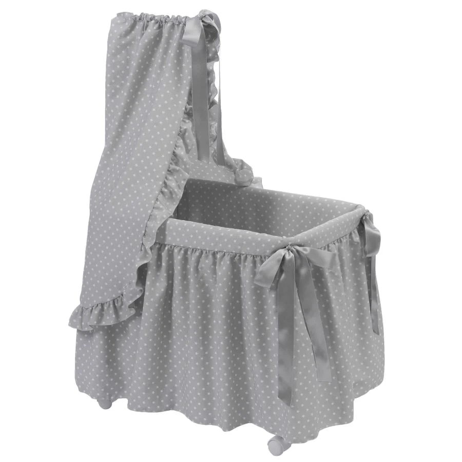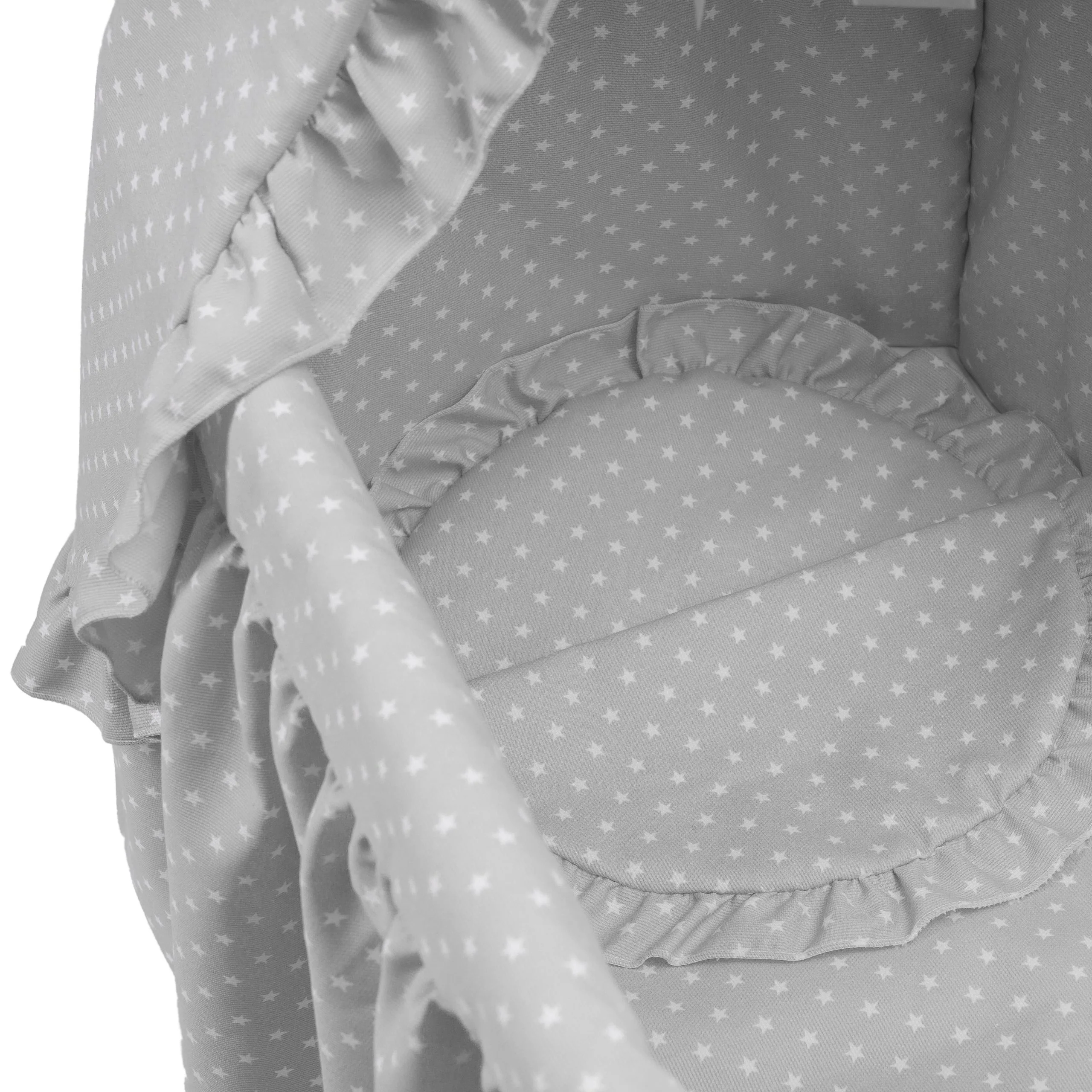 Moisés con dosel y vestidura en piqué canutilllo gris con estrellas blancas.
