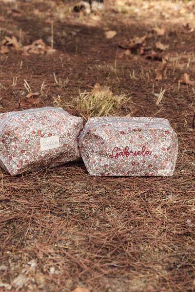 Neceser de flores rositas y granates con hojas verdes con cremallera gris muy resistente en tejido 100% impermeable