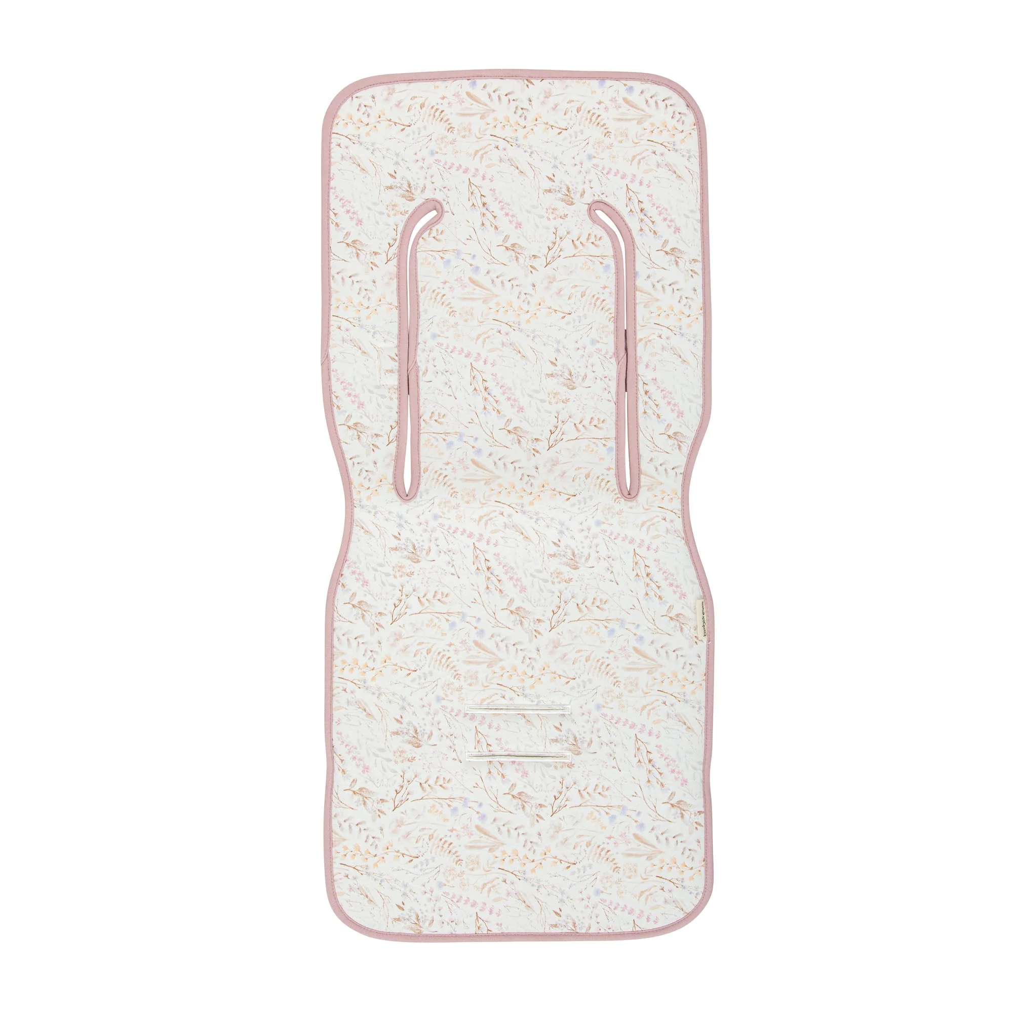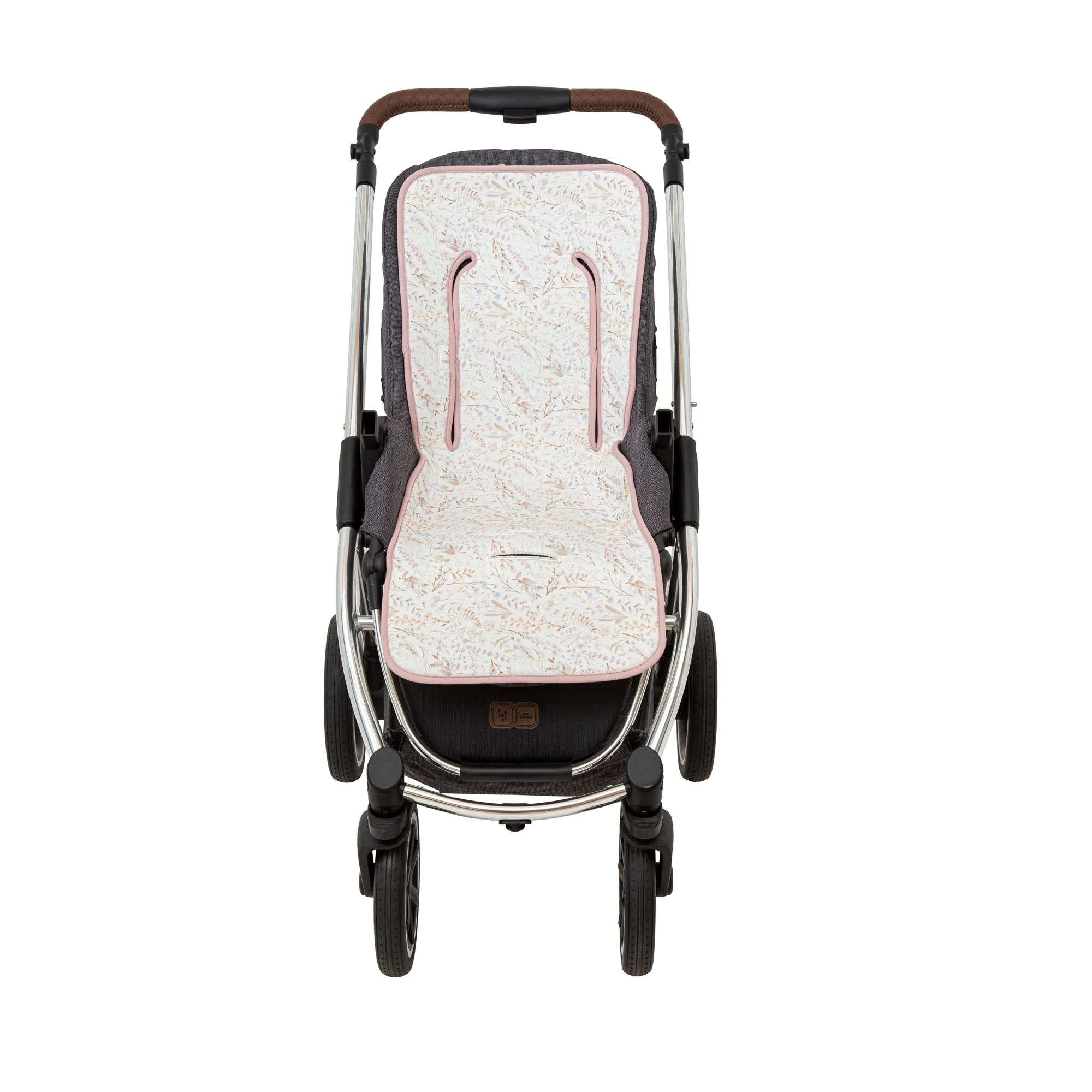 Su ajuste universal y su delicado diseño en blanco y lila aportan un toque dulce y elegante a cualquier carrito, mientras protegen el tapizado original del desgaste y las manchas diarias. Gracias a sus aperturas para los arneses con velcro, cintas superiores y goma en la parte inferior, se coloca y retira fácilmente, adaptándose a la mayoría de sillas de paseo del mercado.