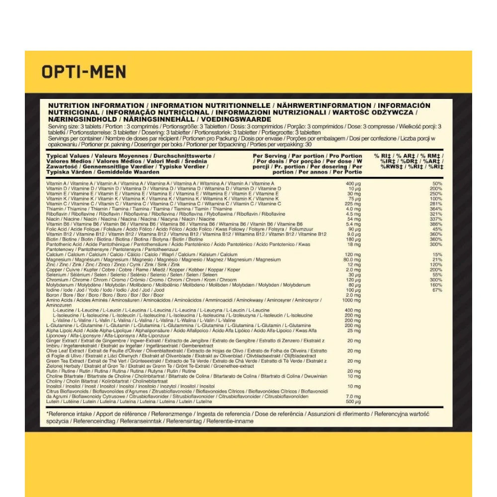 DescripciónOpti-Men™ de Optimum Nutrition es un suplemento que tabletas que contiene la fórmula multivitamínica premium de uso diario para apoyar un estilo de vida activo y la salud general de los hombres que contiene 36 ingredientes activos y nutrientes esenciales.Opti-Men™ es mucho más que un multivitamínico, es una combinación de vitaminas, minerales y una mezcla de extractos de plantas especialmente estudiada para el hombre. Te aporta todos los nutrientes que el organismo de un hombre necesita para mantener y reforzar su salud.Opti-Men™ ha sido especialmente desarrollado para cubrir las necesidades nutricionales de deportistas que poseen un alto desgaste físico y mental.Opti-Men™ tiene una gran efectividad y proporciona unos óptimos resultados en todo hombre, ya que su fórmula entrega la gran mayoría de las necesidades básicas diarias de un hombre que desea darle a su organismo los nutrientes necesarios para un buen funcionamiento.BeneficiosPrincipales beneficios de Opti-Men™ de Optimum Nutrition: Los nutrientes diarios al completo.Las vitaminas, los minerales y otros nutrientes esenciales son los bloques de construcción del organismo. Crean unas bases fuertes y son responsables de los niveles de energía, del rendimiento y de la vitalidad.Hemos diseñado Opti-Men™ como un sistema completo para mejorar la nutrición de cualquier deportista masculino. Al presentar más de 30 ingredientes activos en una sola tableta, hemos creado algo más que un multivitamínico.La mejor solución.No tendrías por qué usar docenas de pastillas ni tragarte el contenido de botellas y sobres para obtener los nutrientes diarios.Opti-Men™ proporciona todo lo básico en una tableta completa y práctica para tomar mañana, tarde y noche.Es el sistema nutricional definitivo para los hombres activos.IngredientesEspesante (celulosa microcristalina), L-leucina, carbonato de calcio, Ácido L-ascórbico, L-isoleucina, L-valina, L-glutamina, agente antiaglomerante (dióxido de silicio), sales de magnesio de ácidos grasos, Óxido de magnesio, acetato de DL-α-tocoferilo, Estabilizante (carboximetilcelulosa de sodio entrecruzada), recubrimiento (agente de glaseado (Hidroxipropilmetilcelulosa), espesantes (glicerol)), Nicotinamida, D-pantotenato de calcio, ácido α-lipoico, Rutina, complejo de bioflavonoides de cítricos en polvo (estandarizado para flavonoides (35%)), borato de sodio, extracto de hoja de té verde (Camellia sinensis), extracto de raíz de jengibre (Zingiber officinale), Extracto de hoja de olivo (Olea europaea), Óxido de cinc, cloruro de cromo (III), picolinato de cromo, fruto de Solanum lycoperiscum en polvo (estandarizado para licopeno (5%)), bitartrato de L-colina, Inositol, filoquinona, sulfato de cobre, molibdato de sodio, Clorhidrato de piridoxina, β-caroteno, L-selenometionina, clorhidrato de tiamina, sulfato de magnesio, Riboflavina, colecalciferol, flor de onagra (Tagetes erecta, estandarizado para luteína (10%)), yoduro de potasio, acetato de retinilo, Cianocobalamina, D-biotina, ácido pteroilmonoglutámico.Modo de empleoComo suplemento dietético para hombres, tomar 1 comprimidos 3 veces al día con comida (desayuno, comida y cena).PresentaciónEnvase de 180 Tabletas.LegalInformación General de Seguridad de Productos UEMarca: Optimum Nutrition Nombre del Fabricante: Optimum Nutrition País del Fabricante: United Kingdom Dirección Postal del Fabricante: 4th Floor, 2 Kingsway, Cardiff, CF10 3FD Correo Electrónico del Fabricante: [email protected] Teléfono del Fabricante: +44123456789 Persona Responsable en la UE: Glanbia Performance Nutrition (UK) Dirección Postal del Representante en la UE: 4th Floor, 2 Kingsway, Cardiff, CF10 3FD Correo Electrónico del Representante en la UE: [email protected] de Seguridad: – Mantener fuera del alcance de los niños. – No exceder la dosis diaria recomendada. – Consultar con un profesional de la salud antes de usar si está embarazada, amamantando, tomando medicación o tiene alguna condición médica. – Este producto no está destinado a diagnosticar, tratar, curar o prevenir ninguna enfermedad. – Puede contener trazas de gluten, soja, leche, huevos, pescado, crustáceos, frutos secos y cacahuetes.