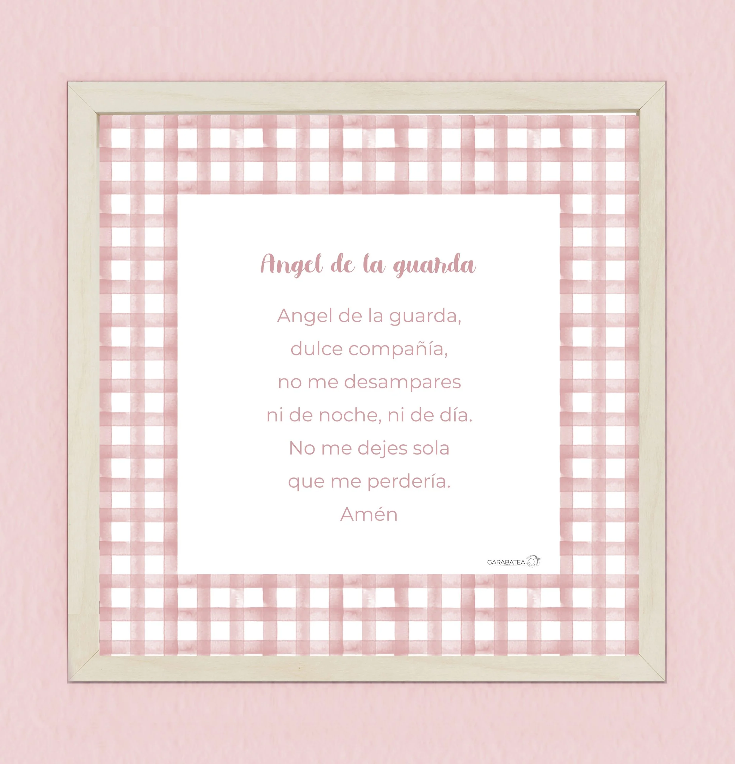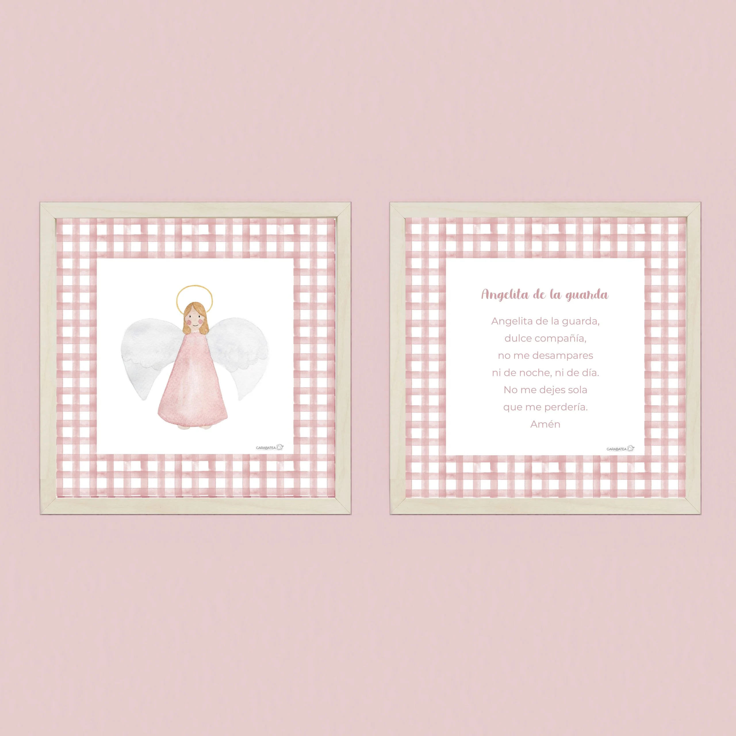 Esta lámina con la oración del Ángel de la Guarda hace pareja con nuestra simpática angelita del mismo color, ambas decoradas al rededor con una franja de cuadros vichy, ideal para decorar una habitación infantil. Disponible en varios colores diferentes.