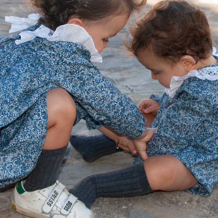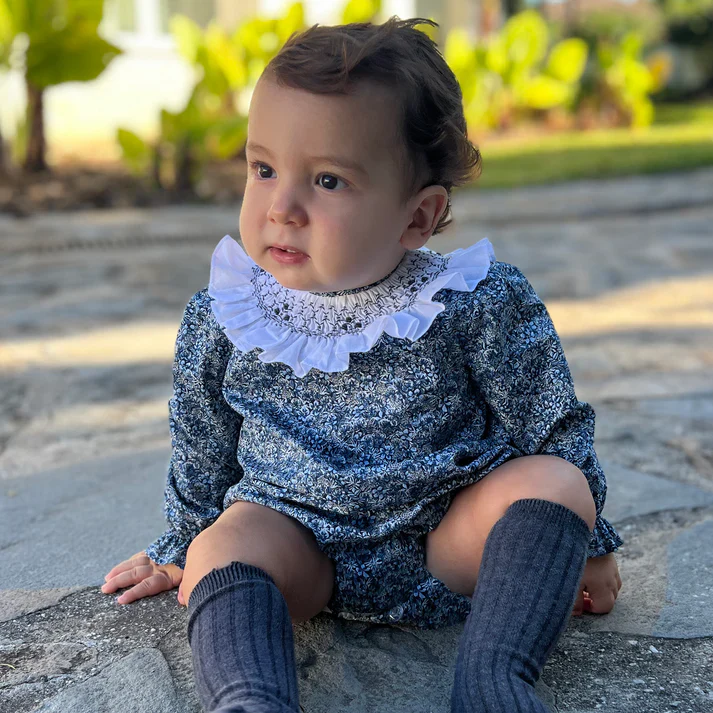 Pelele de manga larga en tejido Liberty London Robin y cuello smock hecho a mano. El modelo Montevideo tiene el cuello en contraste y nido de abeja en hilo gris.