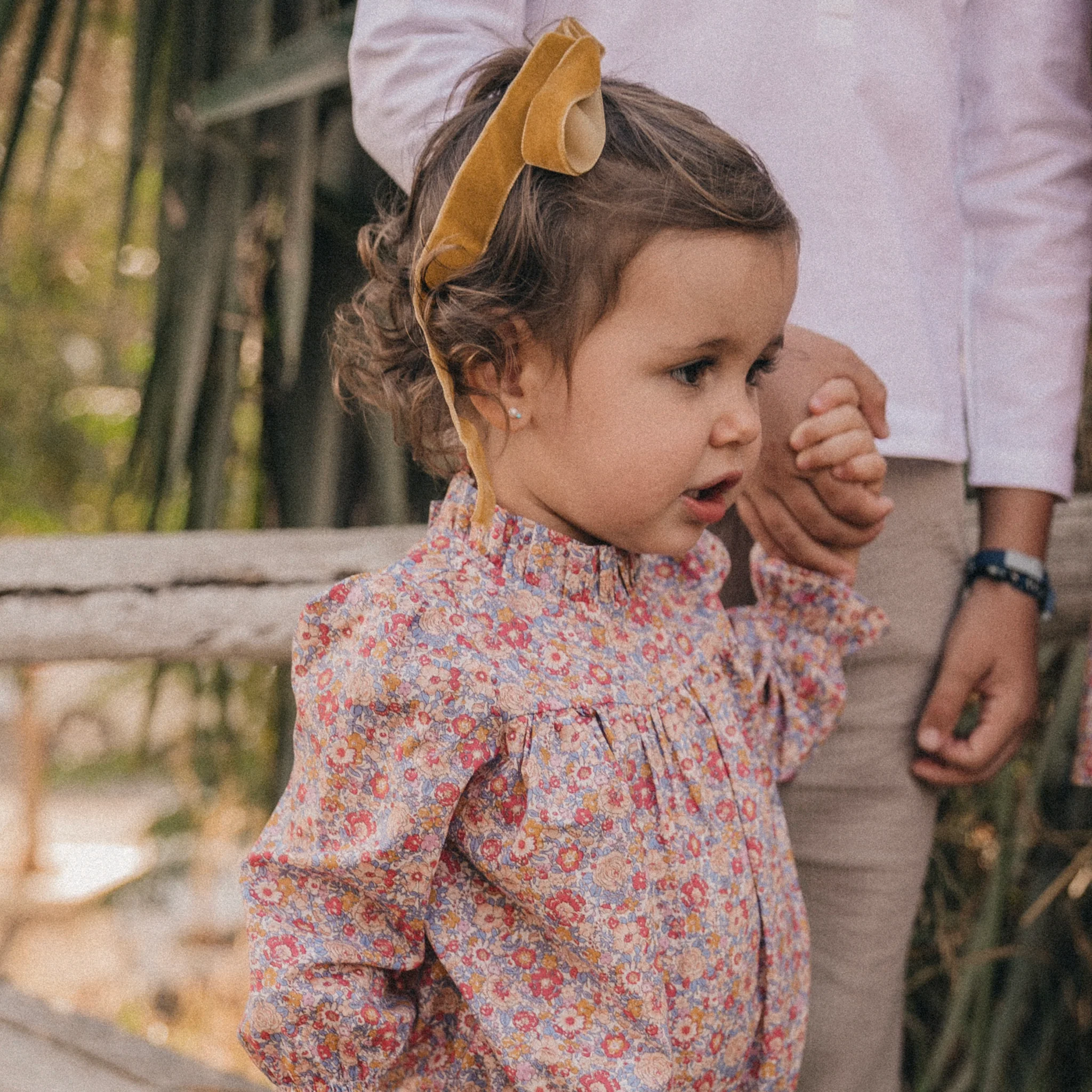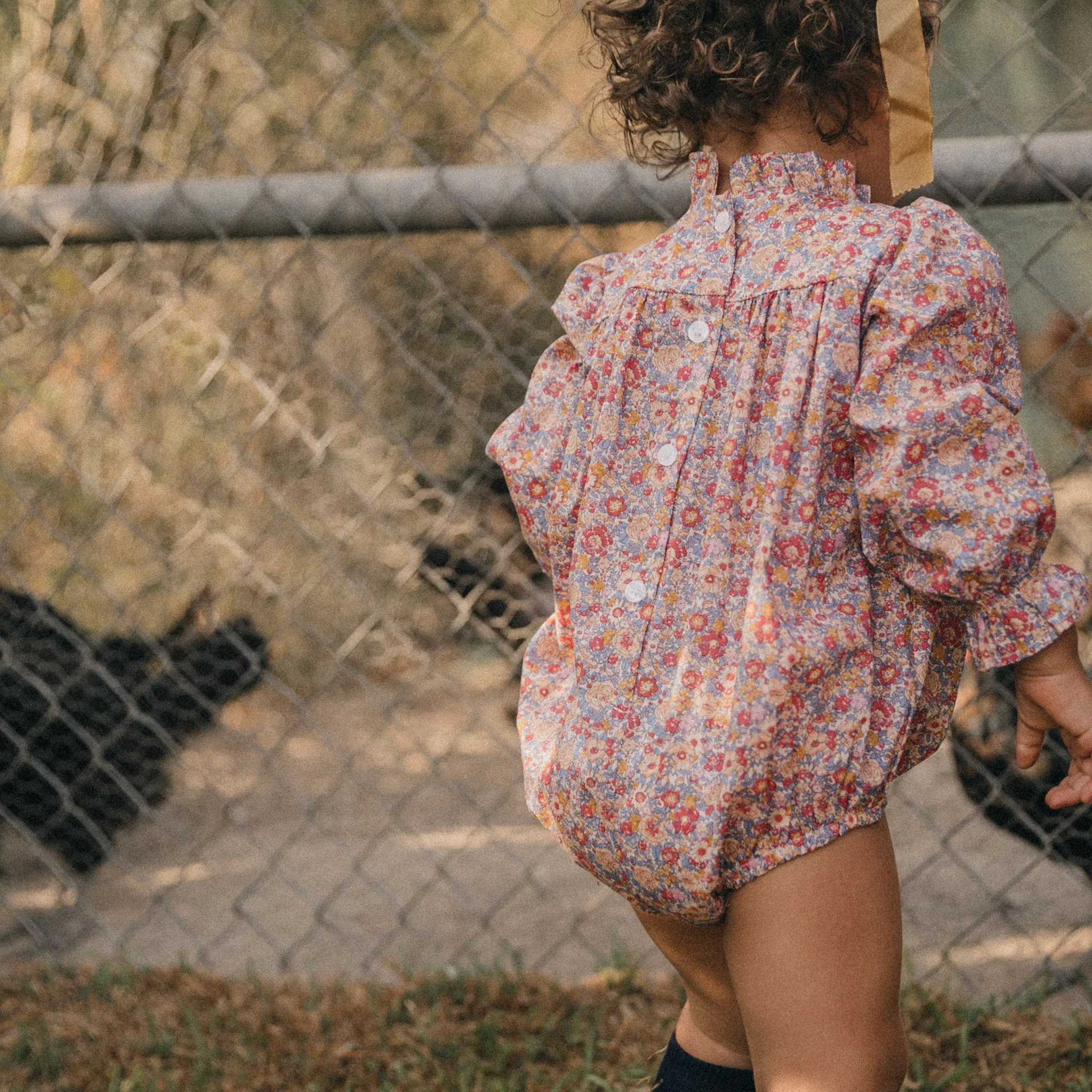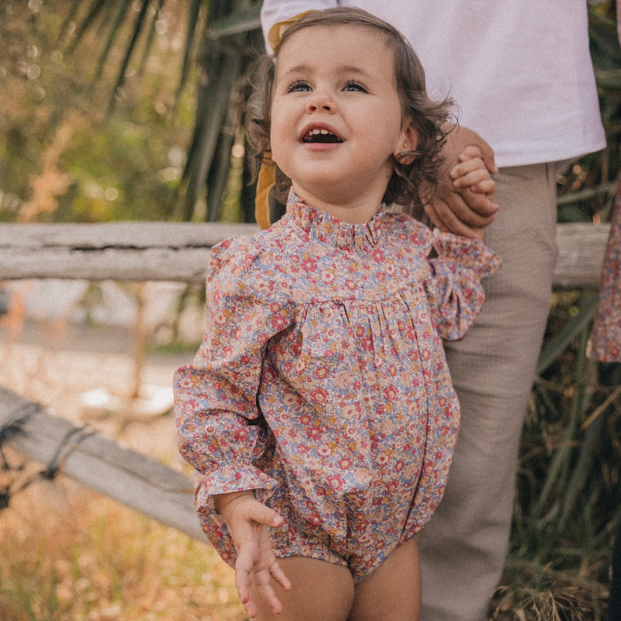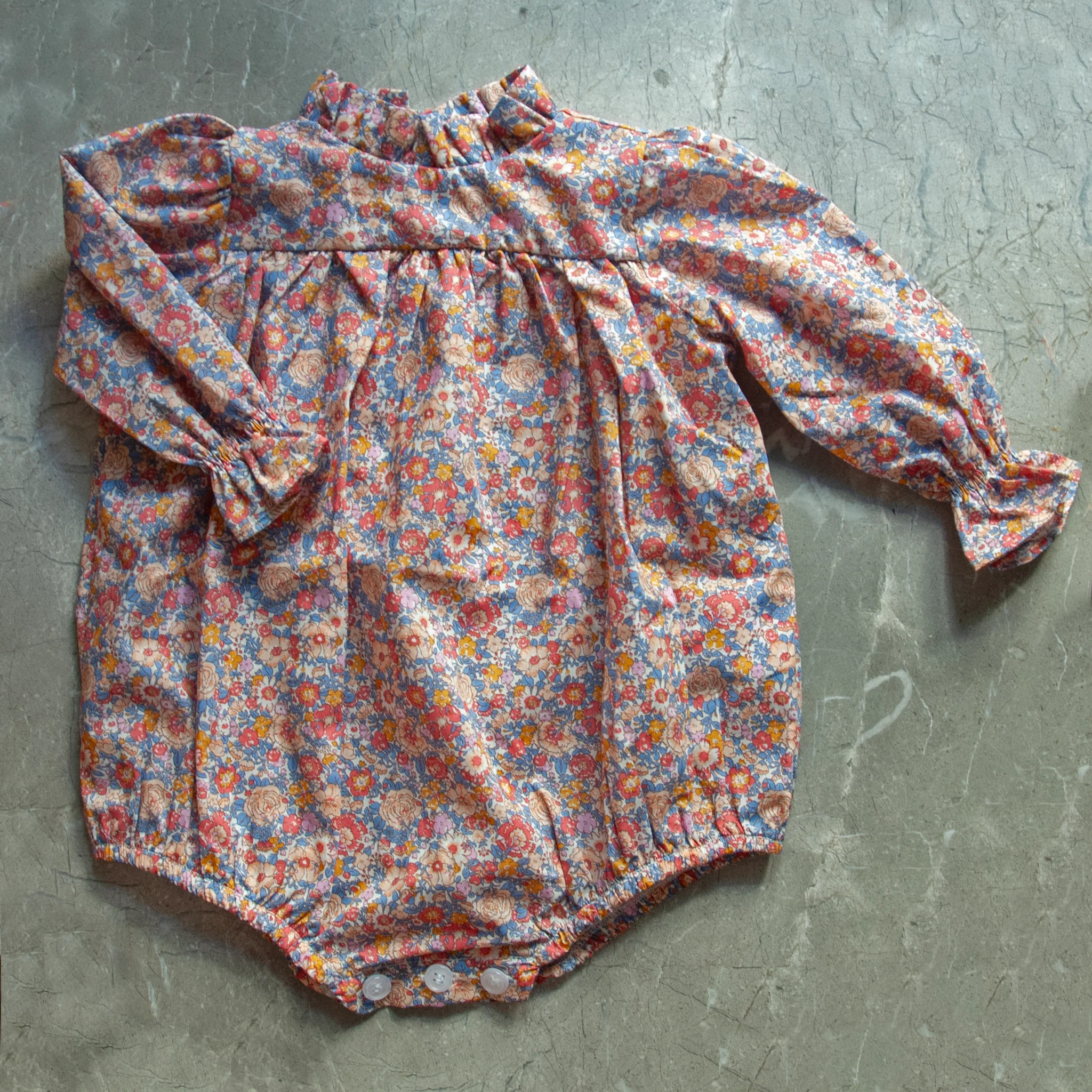 Pelele de manga larga en tejido Liberty London Amelie. El modelo San Sebastián tiene el cuello acabado en volante alto.
