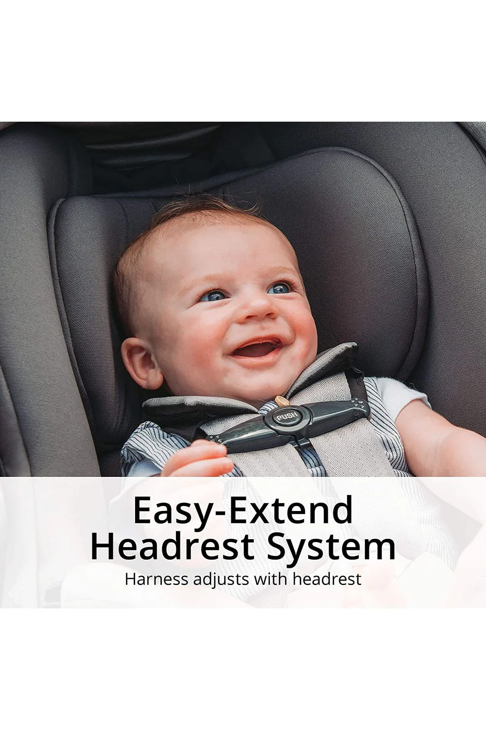• Sistema de reposacabeza EASY-EXTEND: De 5 posiciones que se eleva con el arnés para acomodar el crecimiento de hasta 81 cm de altura, lo que le permite mantener a su pequeño en el mismo asiento de seguridad orientado hacia atrás durante más tiempo.