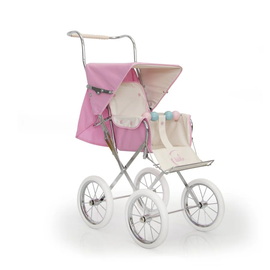 Asiento acolchado confeccionado en stylón rosa ribeteado y forro beige. Respaldo abatible y estribo reposicionable. Interior de capota forrado. Estructura de tubo y pletina con acabado en cromo. Ruedas de 210 mm.