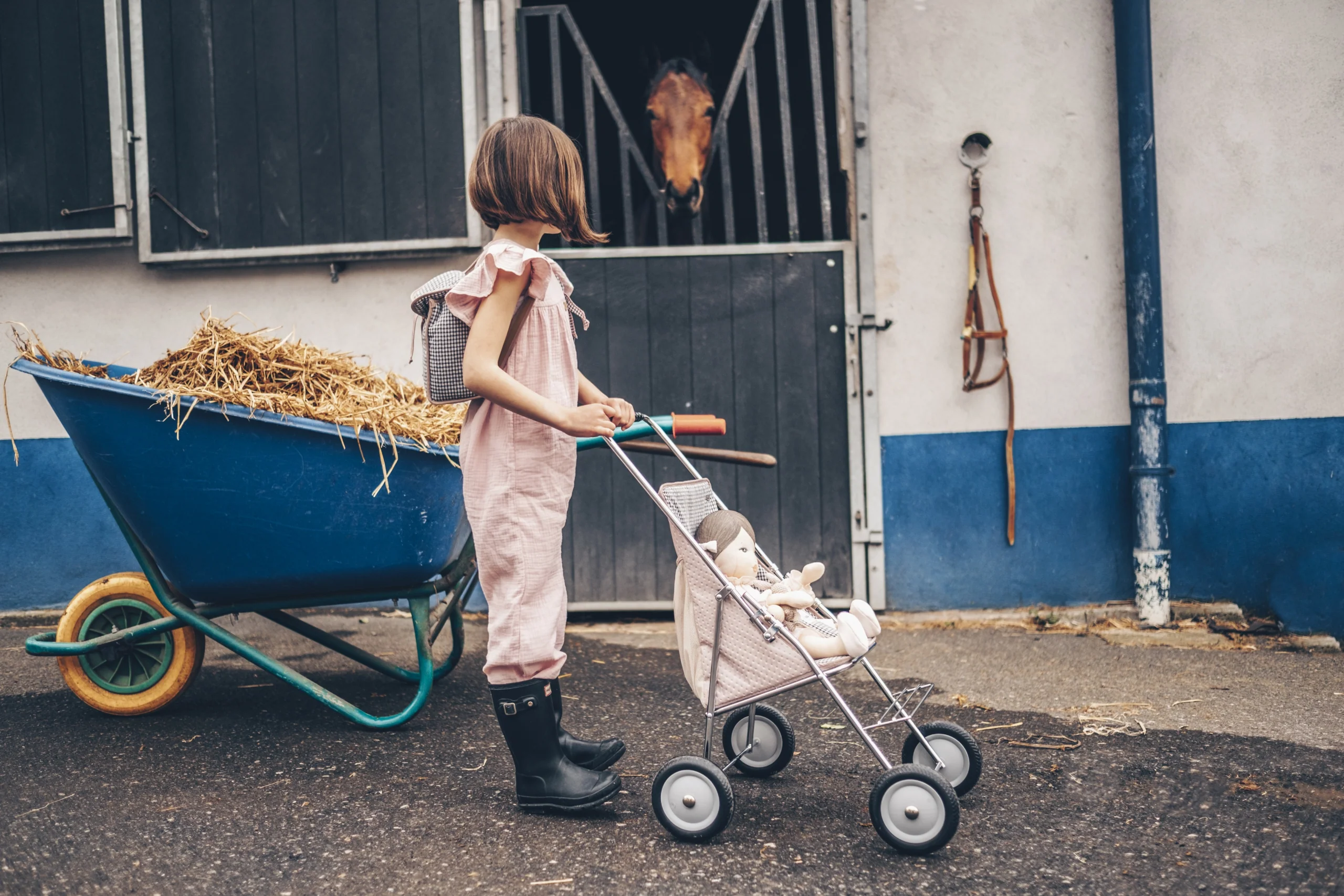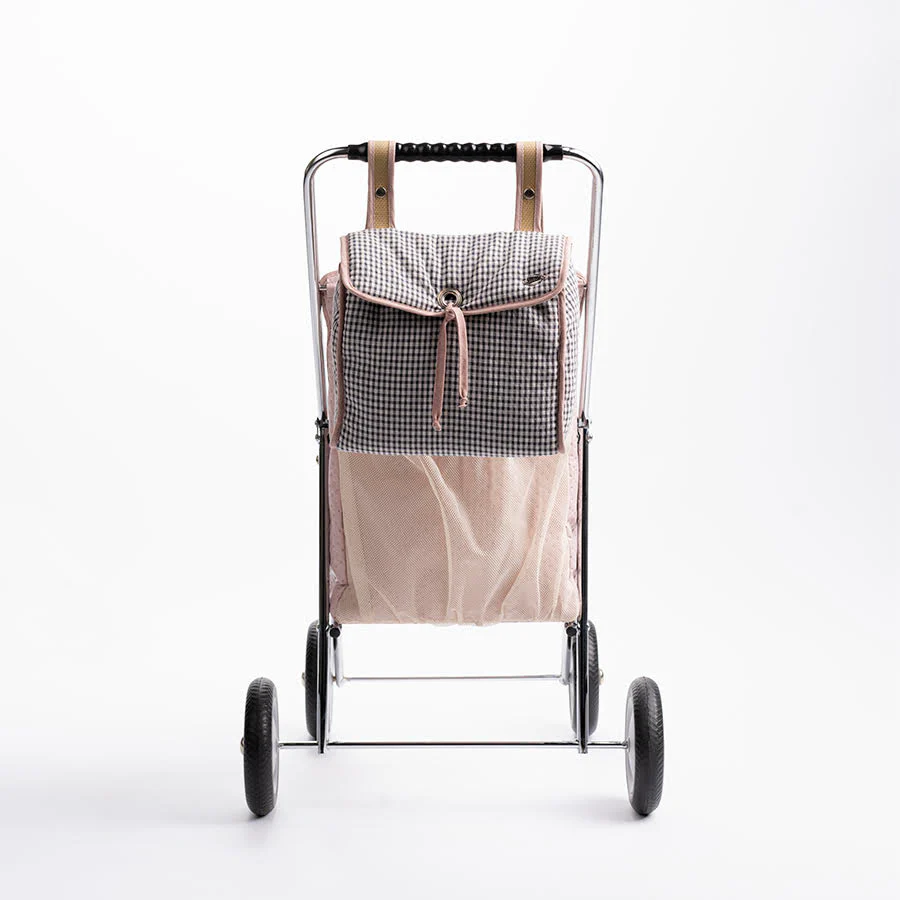 Silla ligera de paseo confeccionada a mano en napa labrada rosa empolvado con interior en Vichy en acabado Seersucker (efecto arrugado) color crudo y antracita.
