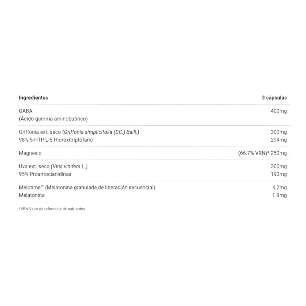 DescripciónReal Sleep Hybrid de la gama BIGscience es una nueva formulación que contiene una combinación sinérgica y aditiva de varios ingredientes, científicamente testados, que mejoran no solo el descanso, sino la calidad y duración del mismo.Ahora, disponible en un nuevo formato en cápsulas con doble velocidad de liberación: sostenida e inmediata.El nuevo Real Sleep Hybrid se presenta ahora en cápsulas de doble acción, liberando de forma inmediata los principios activos necesarios para conciliar el sueño rápidamente mientras que la melatonina granulada presente en la formulación, de la prestigiosa patente Melotime™ se libera secuencialmente a lo largo del ciclo del sueño, incidiendo en la calidad y profundidad del mismo y disminuyendo el número de despertares nocturnos, lo que permitirá al atleta levantarse descansado y pleno de energía a la mañana siguiente. Beneficios Principales beneficios de Real Sleep Hybrid de la gama BIGscience:- Nueva fórmula para mejorar la calidad y duración del sueño.- Nuevo formato en cápsulas con doble velocidad de liberación: sostenida e inmediata.- Con una combinación sinérgica y aditiva de varios ingredientes científicamente testados.- Reduce el tiempo que tardamos en dormirnos.- Mejora el índice de fragmentación del sueño.- Incrementa la cantidad de sueño REM y SWS.IngredientesGABA (Ácido gamma aminobutírico), Óxido de magnesio, Extracto seco de Griffonia (Griffonia simplicifolia (DC.) Baill., semillas), Extracto seco de Uva (Vitis vinífera L., semillas), L-Teanina, Cápsula (Agente de recubrimiento (hidroxipropilmetilcelulosa)), Emulgente (estearato de magnesio), Melotime™ (Melatonina granulada de liberación secuencial). Puede contener trazas de cereales que contengan gluten, leche, soja, huevo, apio, dióxido de azufre y sulfitos, pescado, moluscos y crustáceos.Modo de empleo Como suplemento dietético para adultos sanos, tomar 3 cápsulas al día media hora antes de dormir.PresentaciónEnvase de 90 cápsulas.