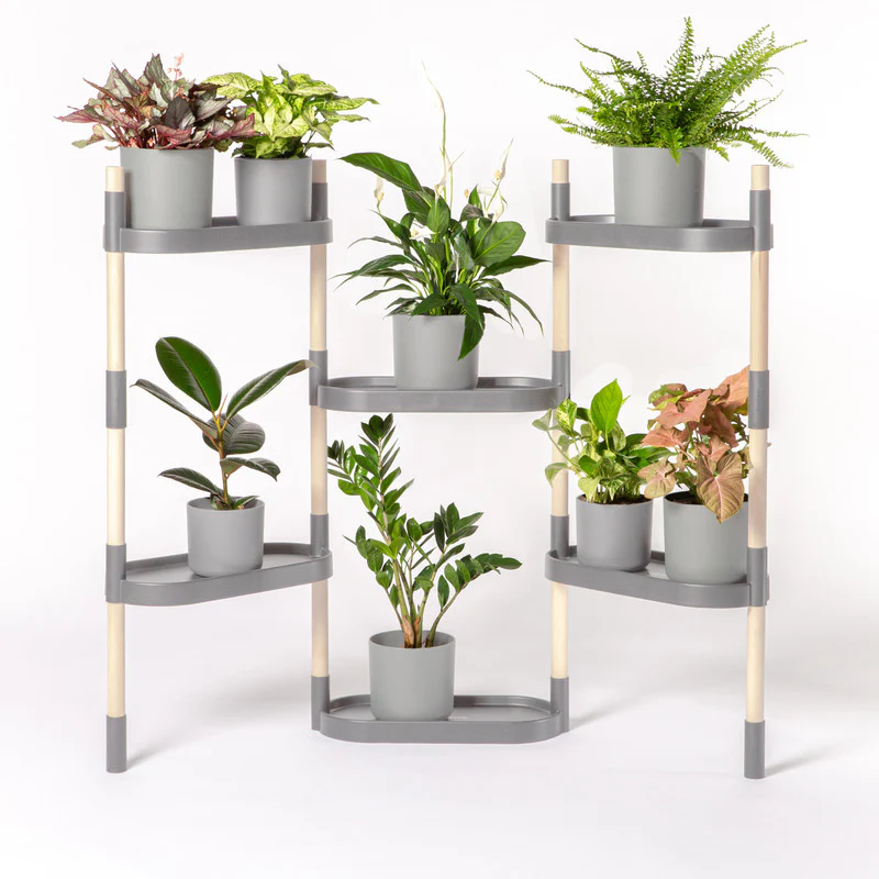 La estantería CitySens es un soporte para macetas y plantas modular y personalizable. Monta la estructura a tu gusto. No incluye plantas. Fabricado en España con polipropileno 100% reciclado y madera ecológica con certificado PEFC. El diseño de las bandejas tiene un reborde de 1 cm de alto que asegura la estabilidad de las macetas y evita que el agua de riego caiga al suelo. La estructura es estable por sí sola, pero si quieres que crezca en vertical o darle un extra de estabilidad, la puedes sujetar fácilmente a la pared con ganchos adhesivos o alcayatas. Fabricada en España por personas con capacidades diferentes.