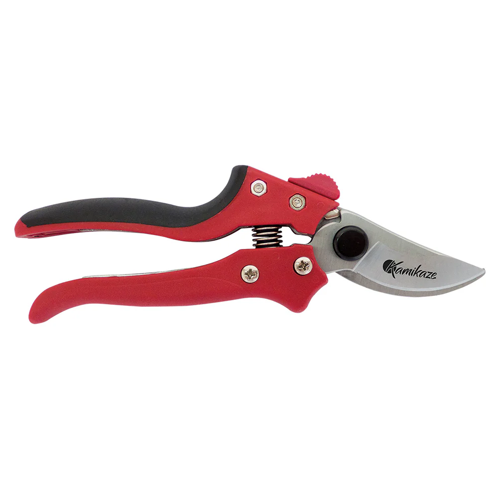 Tijera de poda de 1 mano diseñada para jardinería y paisajismo. Modelo con mangos de plástico revestidos de caucho (el mango superior) para repartir mejor las presiones de la mano, hoja y contrahoja de acero y tope de caucho que amortigua el golpe final del corte.