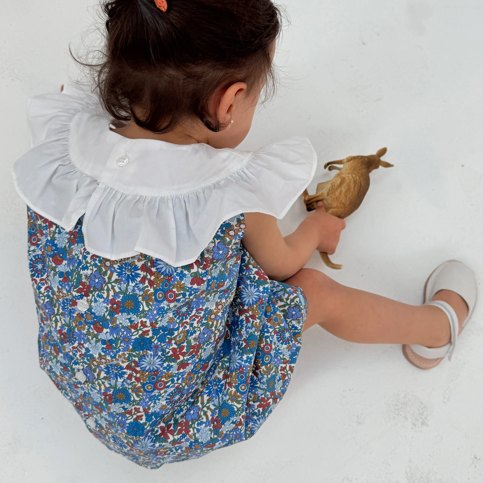 Vestido con cuello volante en contraste. Este modelo es perfecto para para cualquier evento de este verano. Viene con braguita hasta la talla 4a.