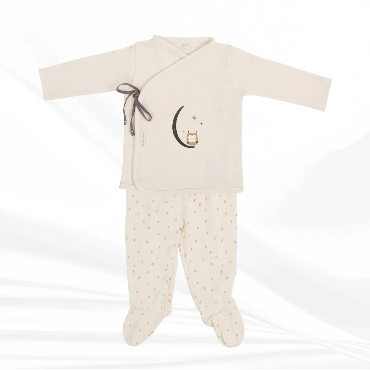 El conjunto Wonderland, en un tono beige neutro, combina con cualquier mantita, arrullo o accesorio. Es perfecto tanto para niño como para niña, y su estilo minimalista lo convierte en una pieza ideal para fotos y recuerdos de esos primeros días.